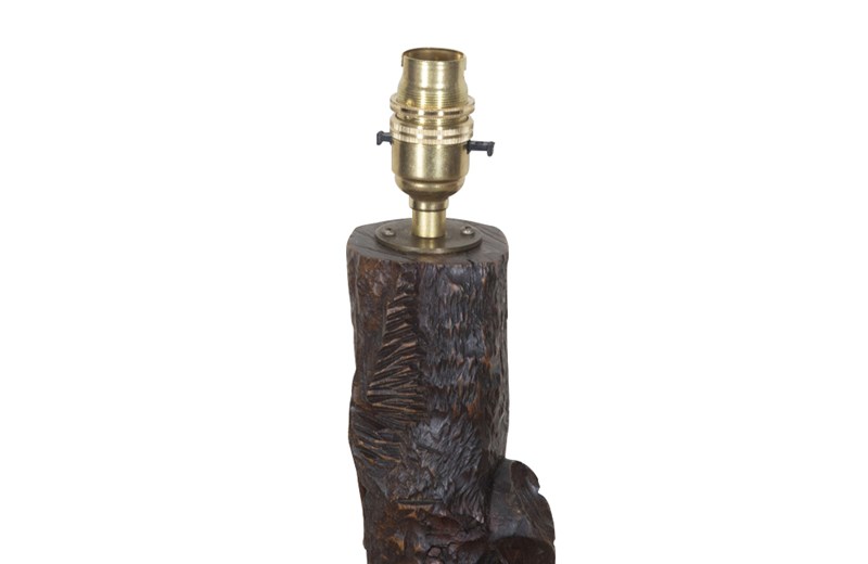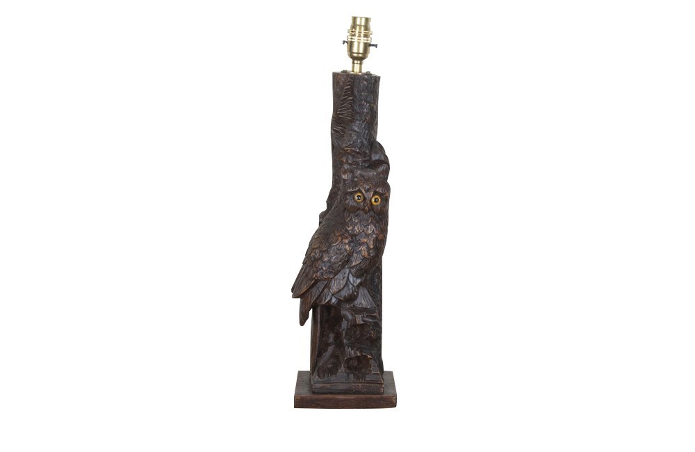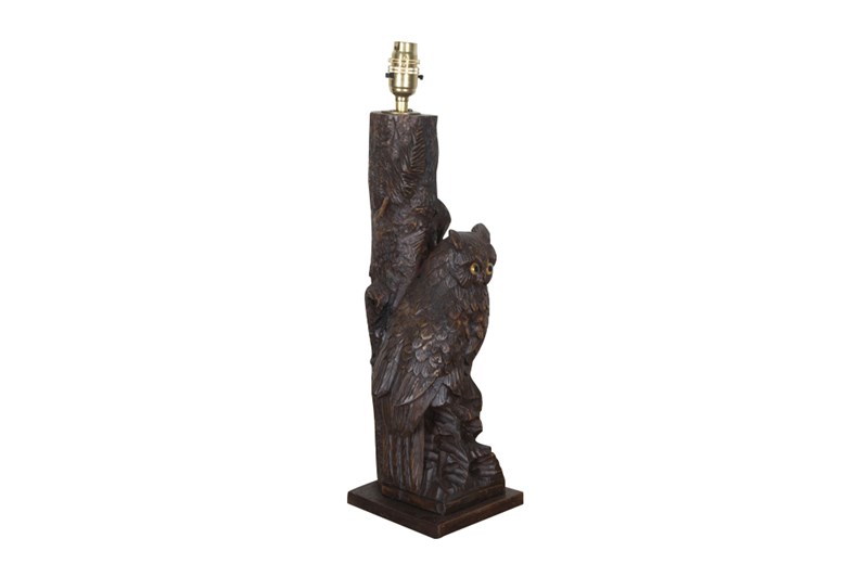 Charming , carved table lamp in the form of an owl perched on a tree branch. The sweet little owl is beautifully carved in the Black Forest style with wonderful expression and has glass eyes. Switzerland , early 20th century