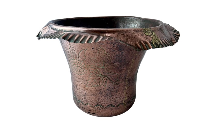 Copper champagne or ice bucket decorated with the armorial crest and coat of arms of King Henry IV, to one side. The other side is decorated with a fruiting grage vine. Circa 1920