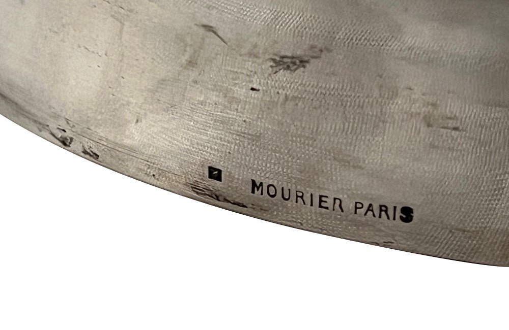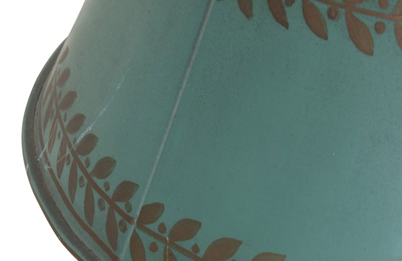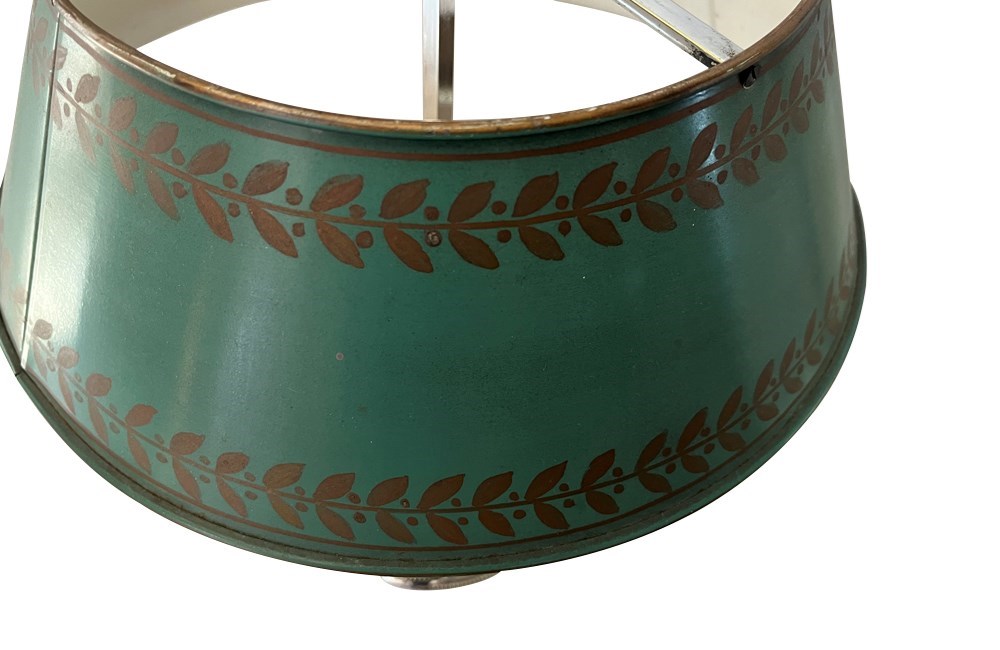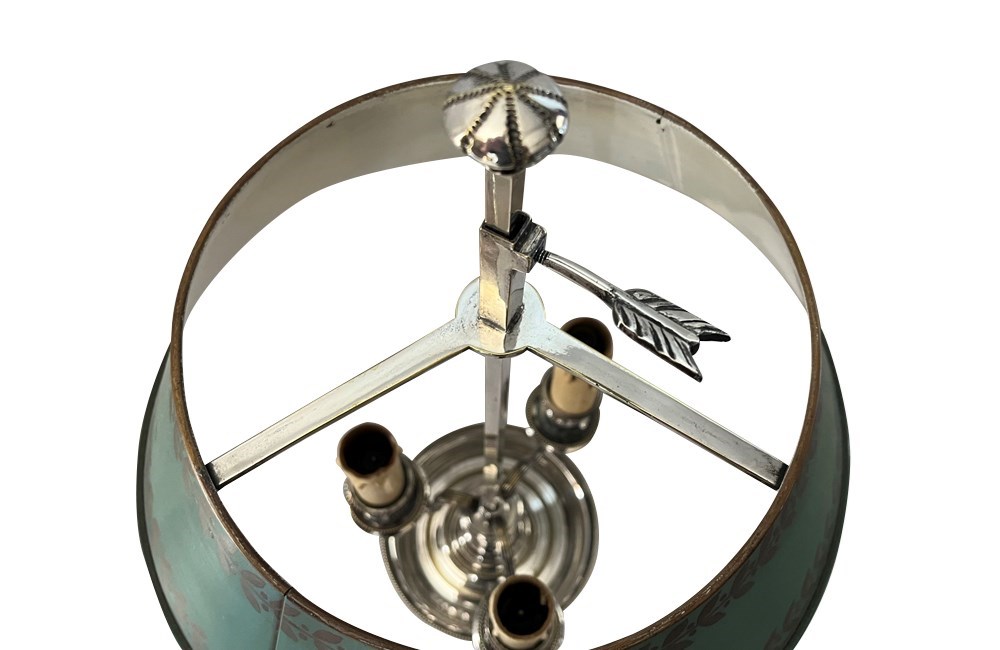 With height adjustable turquoise blue and gilt tole shade. The central Neo-Classical style urn holds three curved arms with candle / bulb holders. Bears the hallmark of the silversmith A. Mourier, Paris.