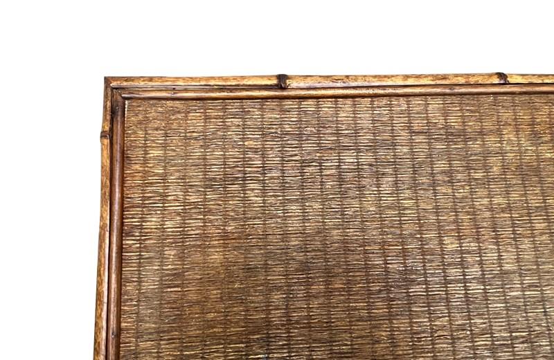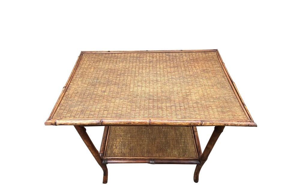 Early 20th Century French bamboo side table with two rattan shelves. Circa 1920