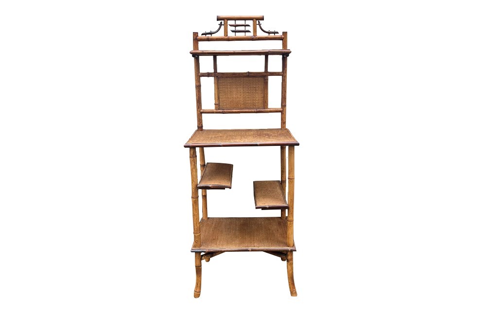 Charming early 20th Century French bamboo open frame etagere with five woven rattan shelves.