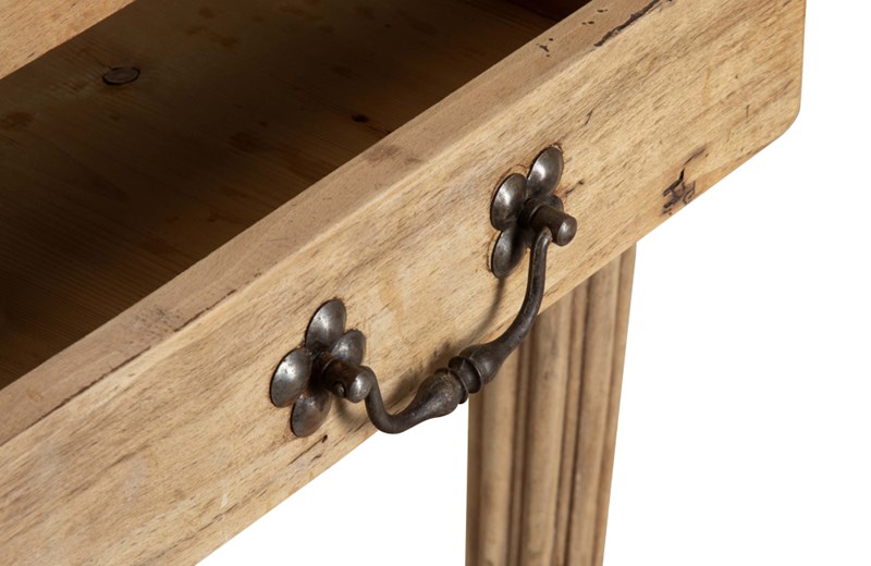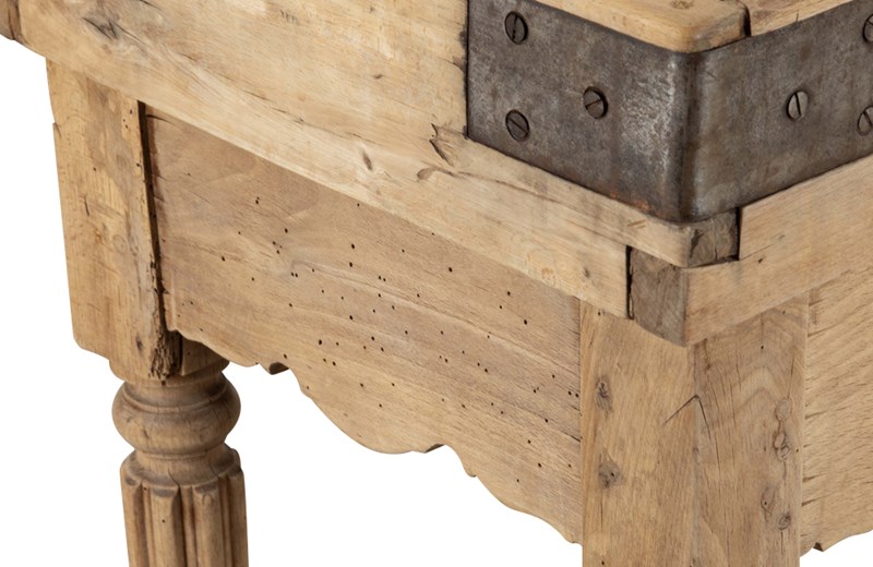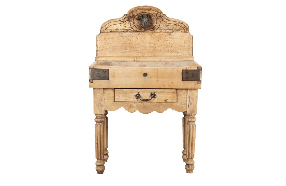 The hardwood chopping surface top is beautifully worn with deep, honest wear acquired through decades of use. The block is raised on turned fluted legs with a shaped apron and fitted with a single drawer retaining its original iron handle. To the rear is a decoratively shaped and carved backboard embellished with an iron boars head and a knife slot. Iron corner straps.