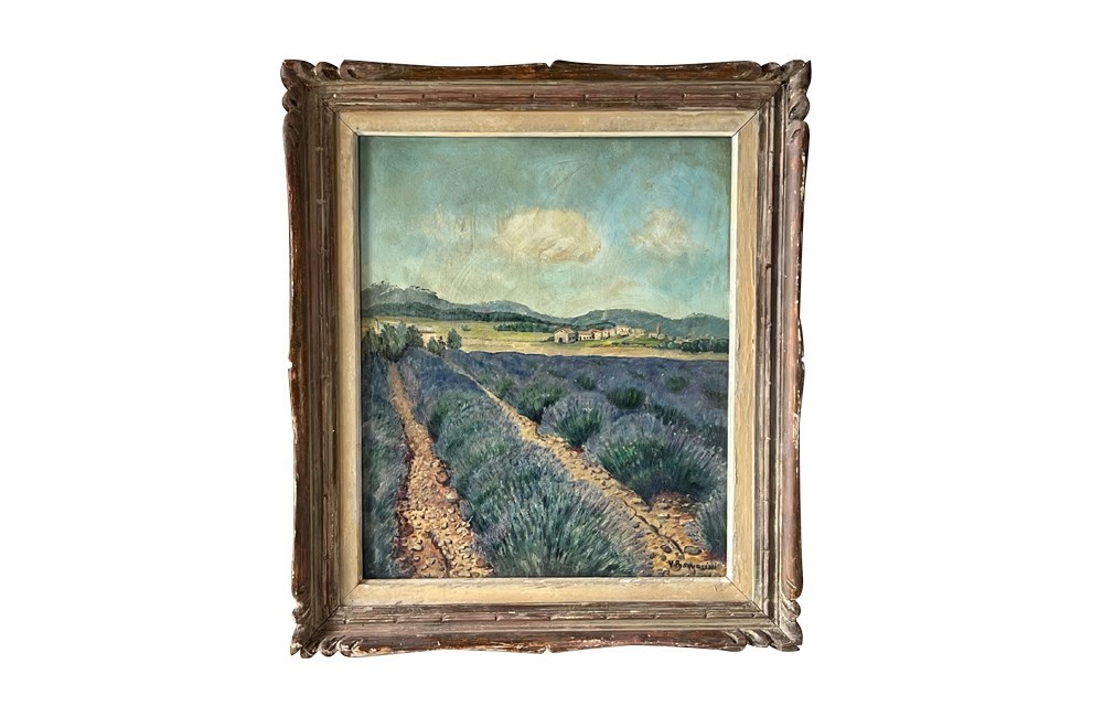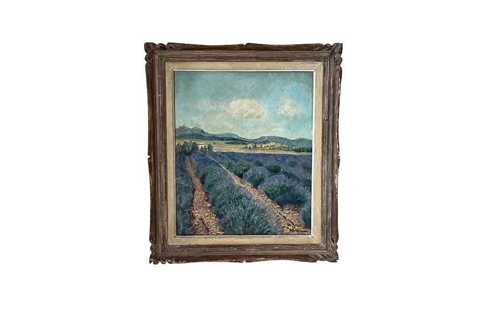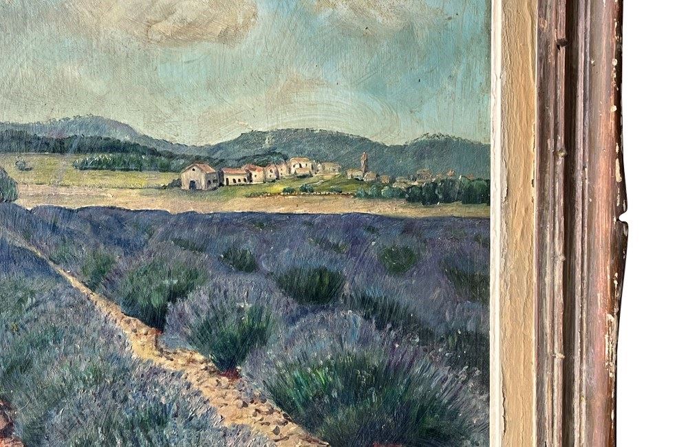 Charming mid-20th Century French oil painting depicting rows of lavender fields in Provence, leading toward a small rural village and rolling hills beneath a luminous blue sky.