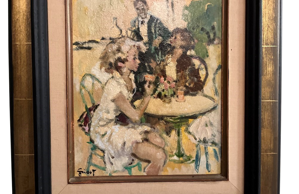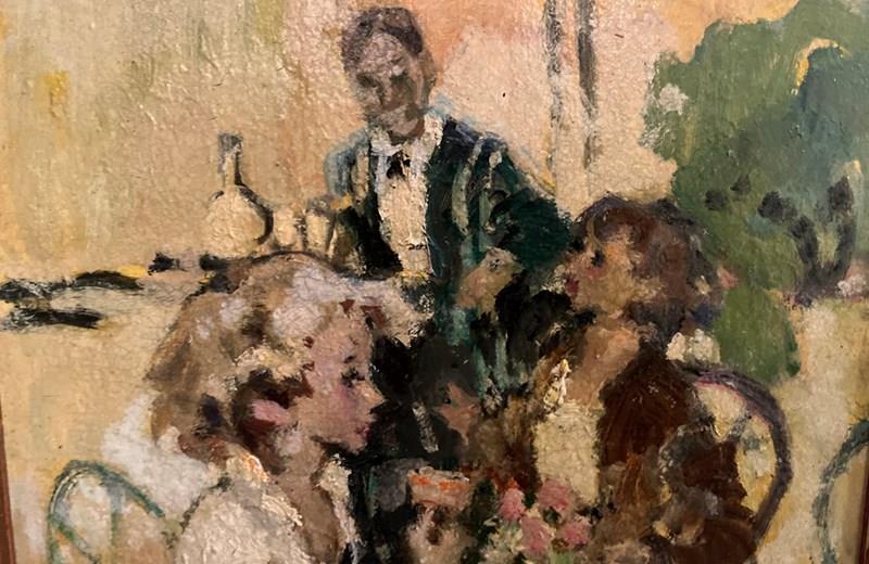 Framed painting of a cafe scene on the Champs Elyses, Paris. A young woman sits with a glass of wine. To the rear we see second woman chatting with a waiter, tray in hand.