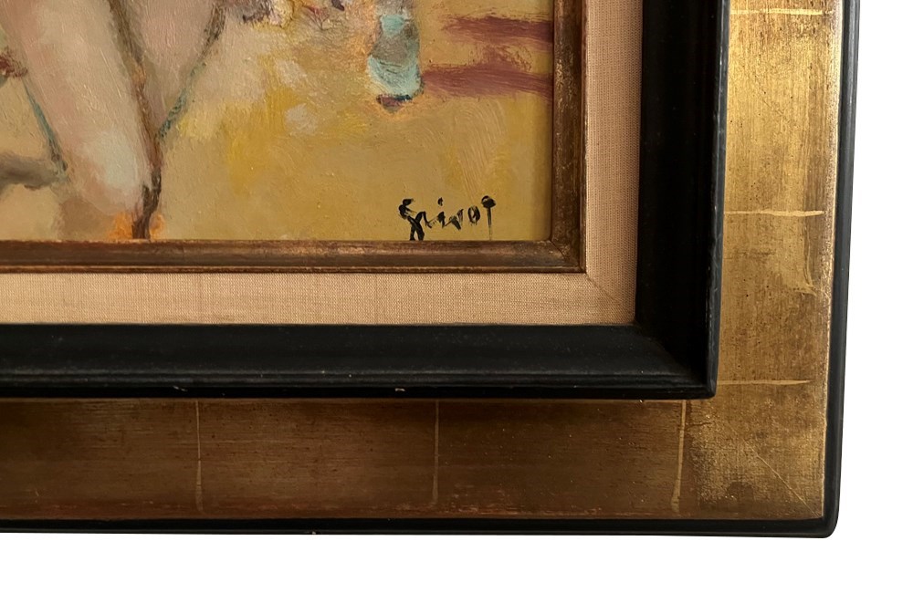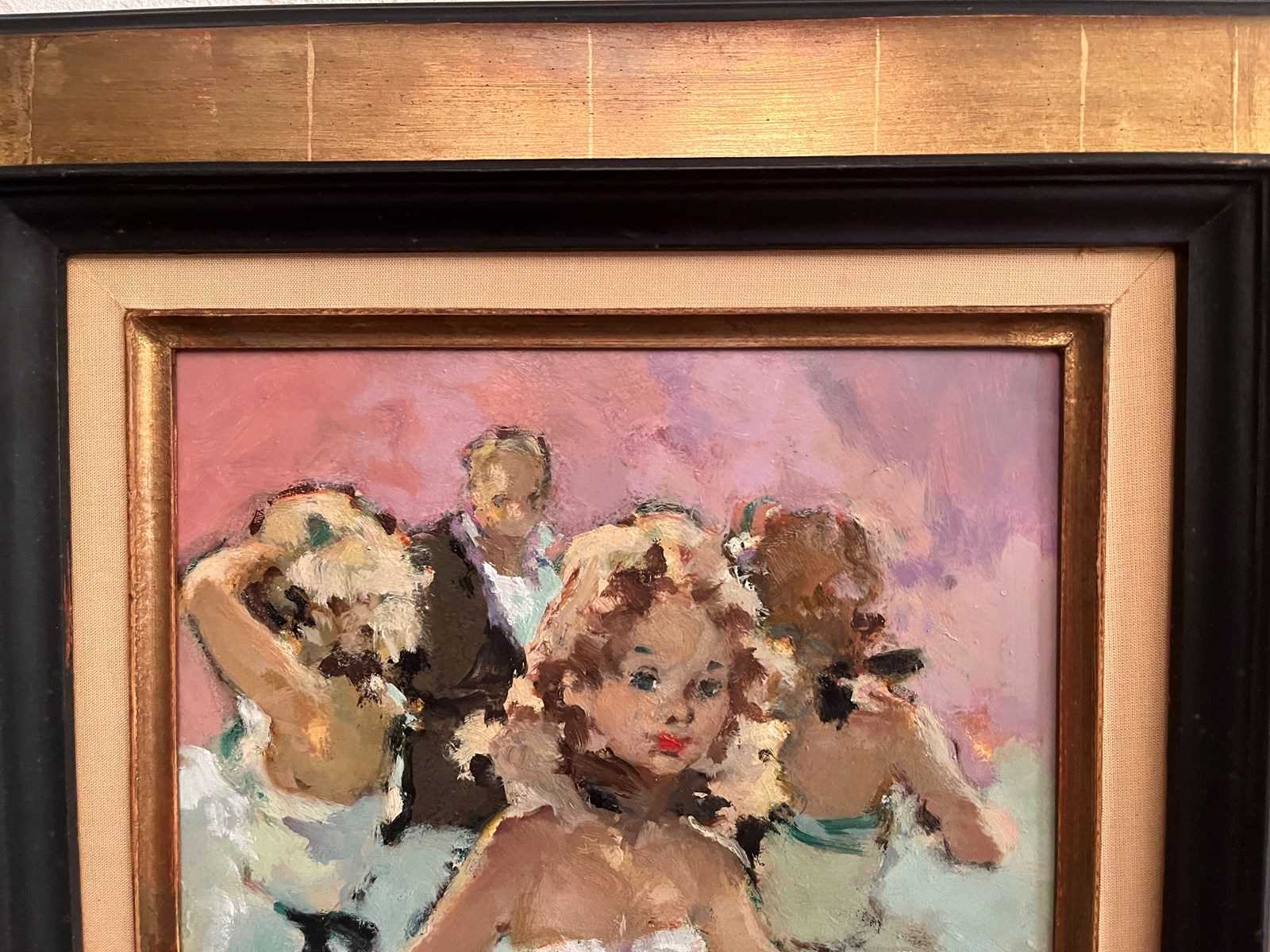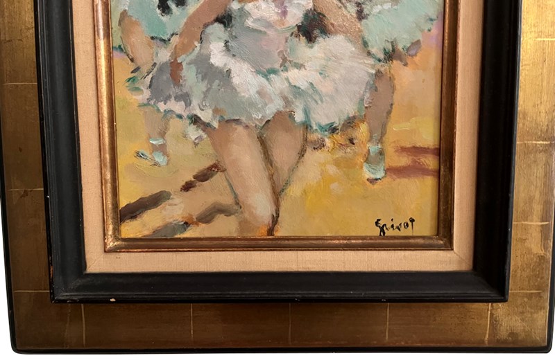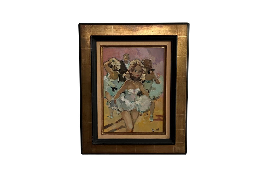 To the rear are another two dancers and the impresario. Signed to the lower right by the artist, Grisot. Annotated to the rear with the title. In a gilt frame.