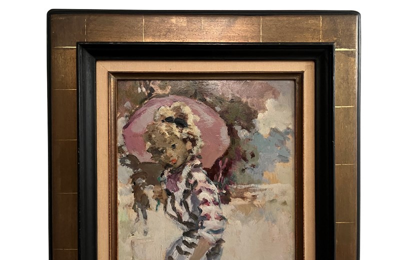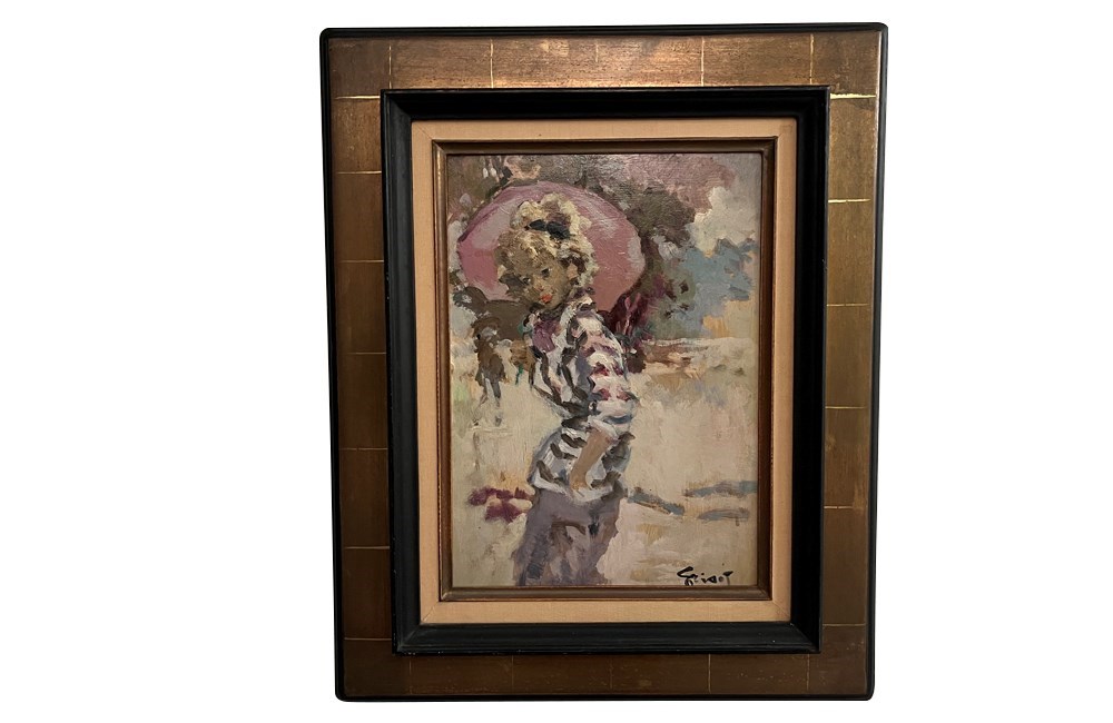 Charming painting of a young stylish Parisienne woman with open umbrella on a rainy day in Paris. Signed to the lower right by the artist Pierre Grisot. Annotated to the back with the title.