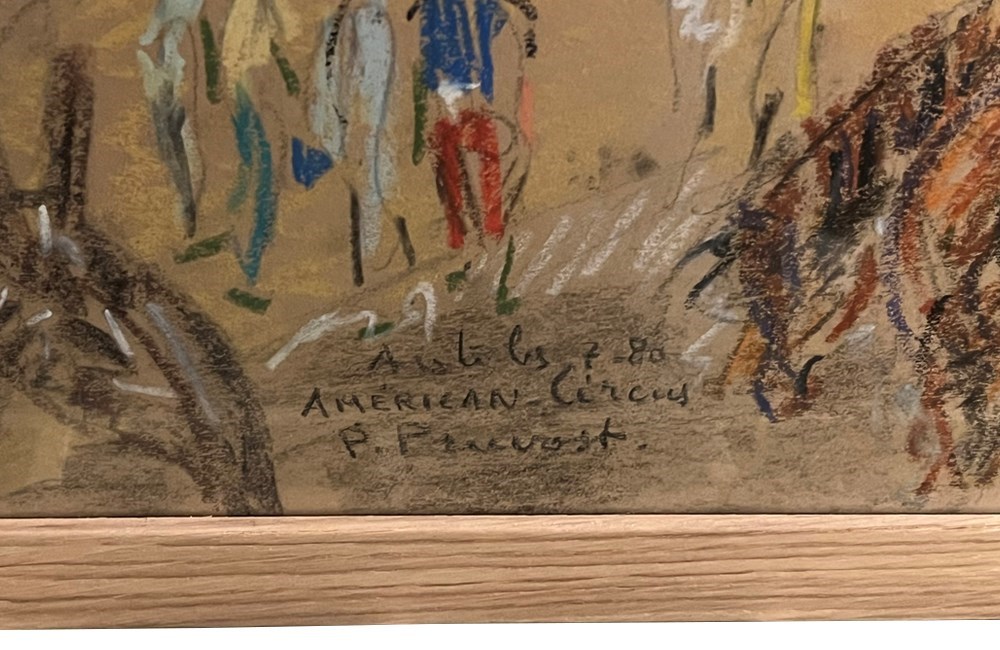 Signed and annotated to the lower left by the artist, 'Antibes, American Circus, P. Provust'. Framed behind glass in simple wooden frame.