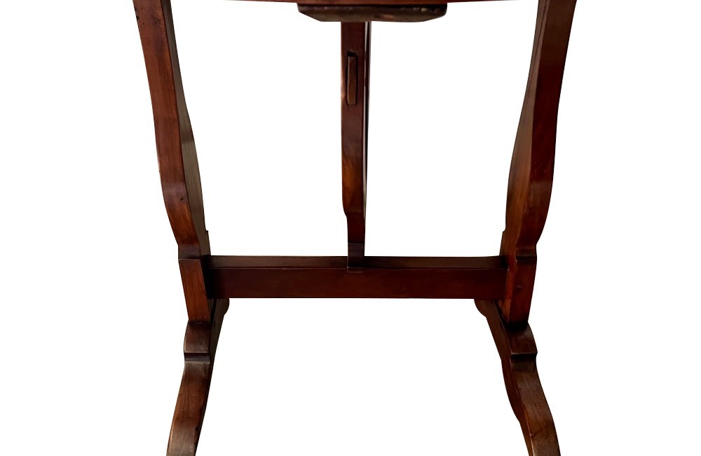 Charming, small round cherry wood French vigneron table .With turning lyre shaped support to shaped base.
