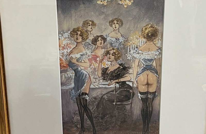 Original unsigned watercolour on paper depicting a cheeky theatrical Belle Époque cabaret salon scene, likely Parisian, circa 1895–1915. The composition features elegantly posed female performers in period costume, rendered with soft, atmospheric washes and fine line work typical of turn-of-the-century French illustration.