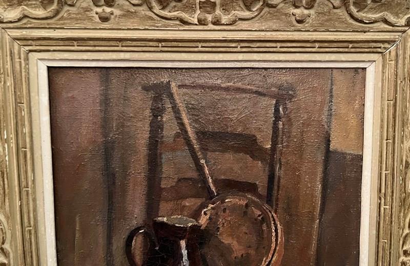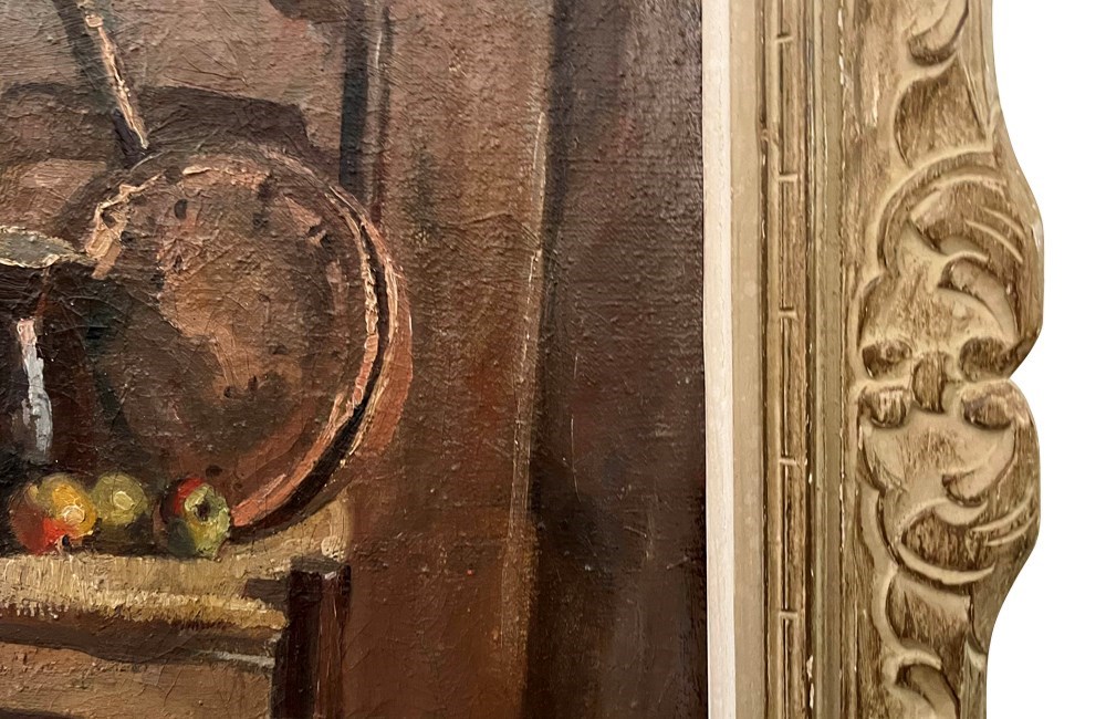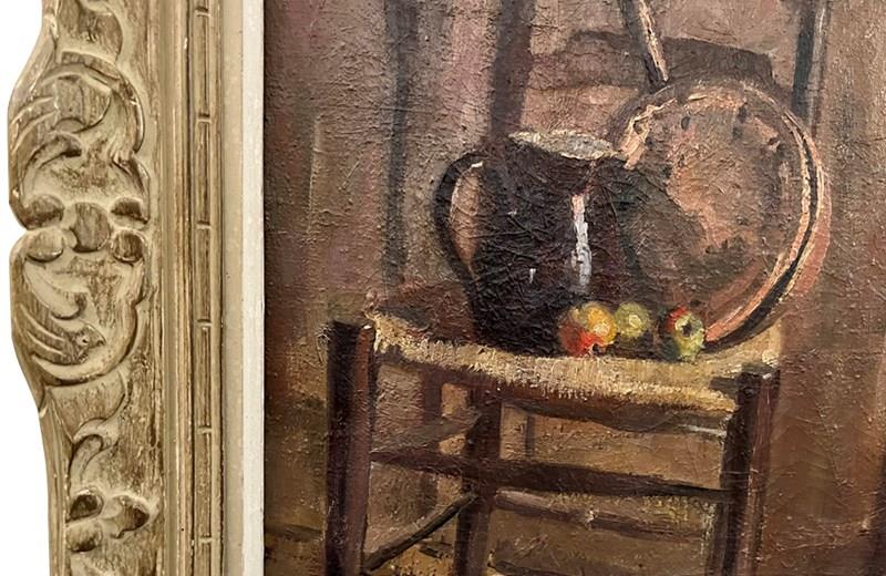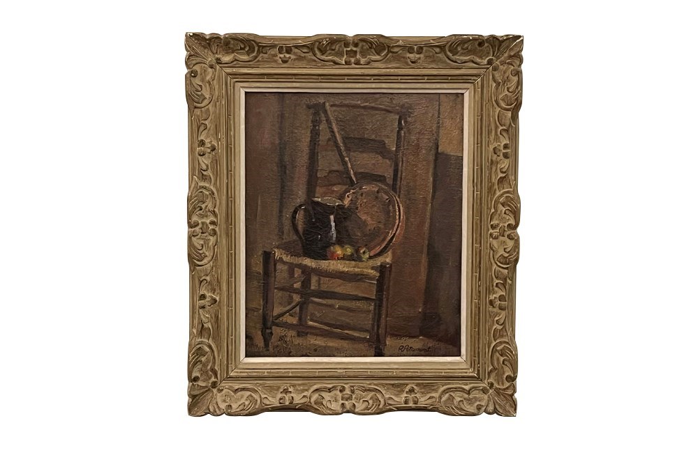French Framed Still Life Painting 'Strawed Chair With Apples'