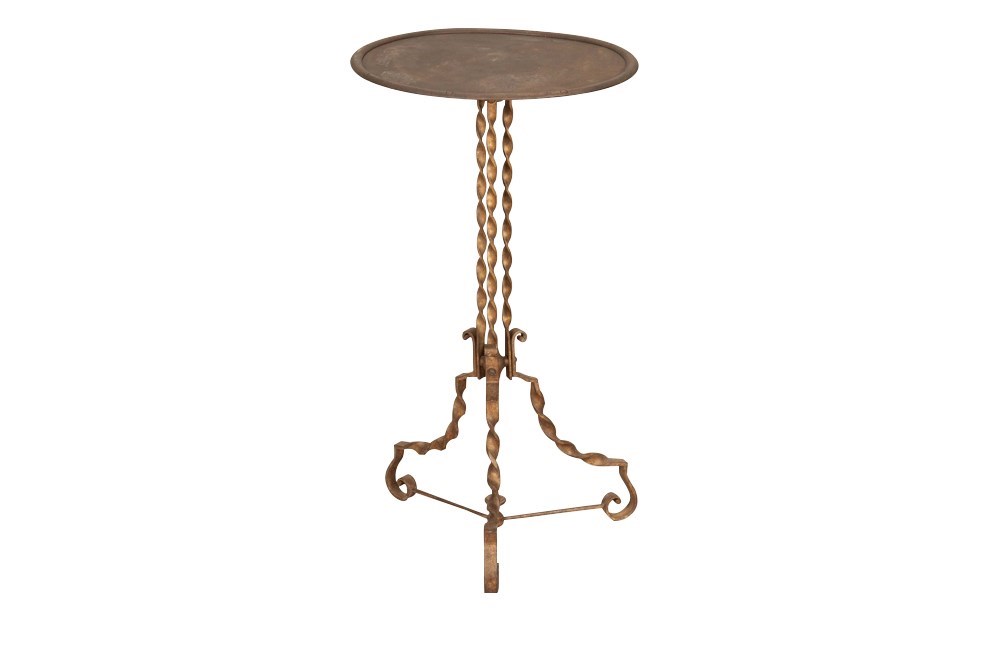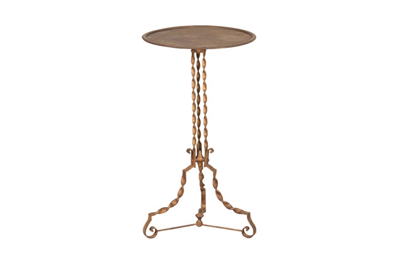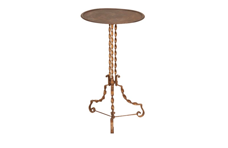 On three twisted iron downrights, joined with a double ended finial and terminating on a tripod base. With a cross stretcher joined by a further decorative finial.