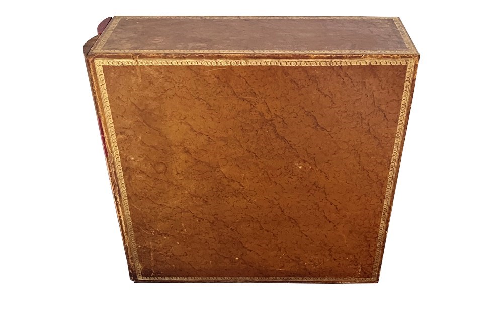 The exterior is leather covered and the book spine lid opens on brass hinges.