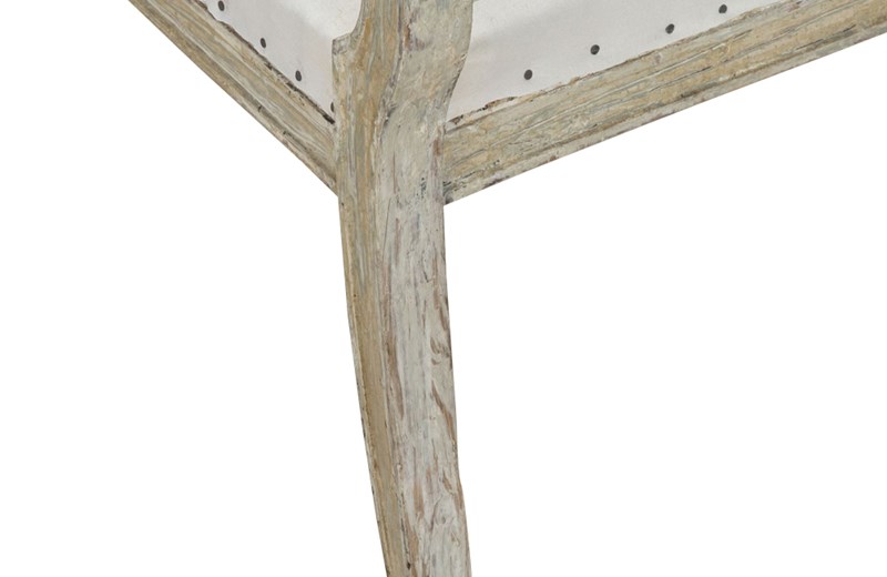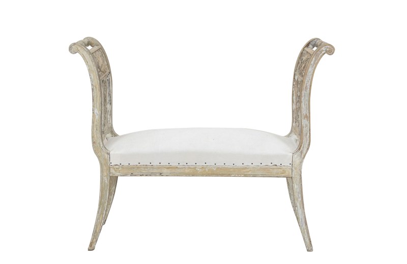In simple antique linen, this charming bench is ready for recovering or can be left as is.
