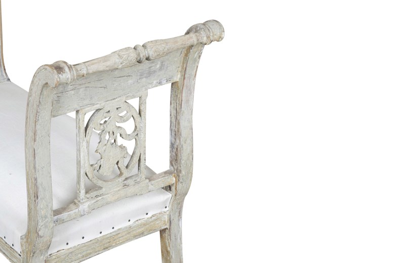 With raised ends carved in the Neo-Classical style. Both ends featured an open carved flower filled basket suspended from a ribbon. Above one is a cabreta (French bagpipe) and to the other an artists palette with brushes, both with laurel leaves and bows. To the top of each end is a turned stretcher with carved acanthus to the centre.