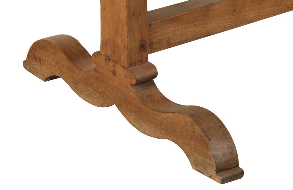 Featuring a beautifully proportioned oval top supported by a sculptural trestle base. The timber has developed a rich warm honey tone, enhancing the depth of the grain and lending the piece a refined yet authentic character. The plank-constructed top rests on a graceful base with shaped feet, substantial uprights, and a striking curved brace centred on a turned finial detail. This architectural base provides both strength and visual presence, giving the table a balanced silhouette that sits comfortably in both classic and contemporary interiors.
