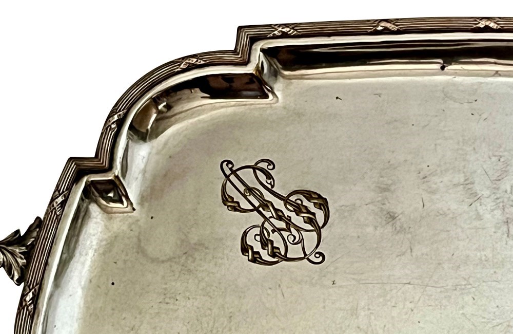 Beautiful, large late 19th Century French shaped silver plate serving tray with monogram to top left corner.