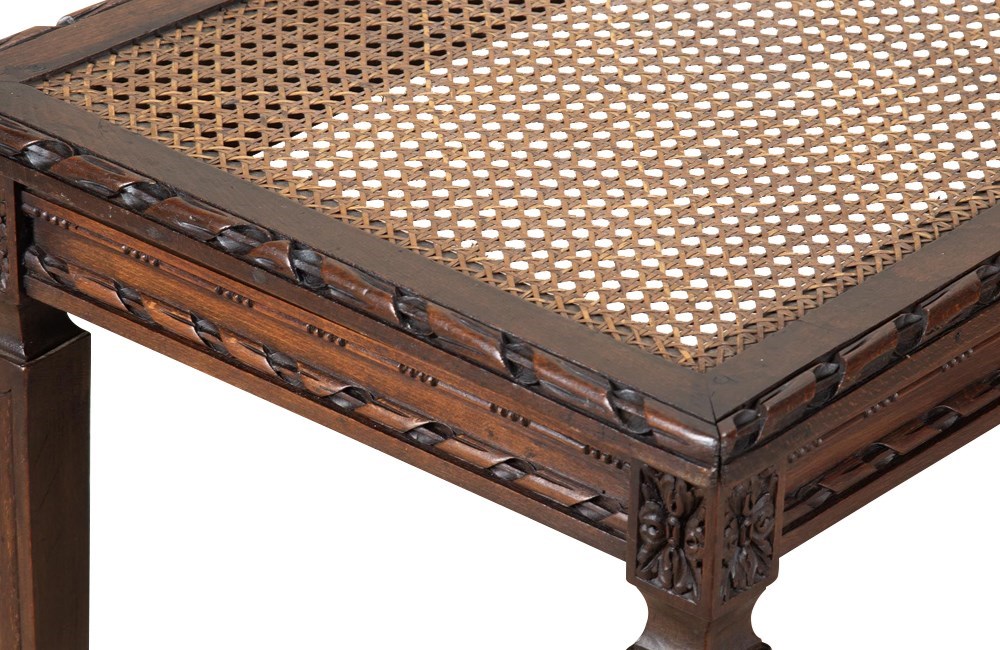 The frame is adorned with ribbon, twist and beaded carving along the apron, punctuated by delicately carved floral corner blocks. Slender, tapered legs terminate in carved feet. The original caned seat, tightly woven and beautifully patinated, is framed by further ribbon-twist decoration.