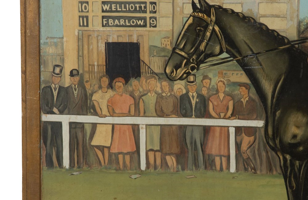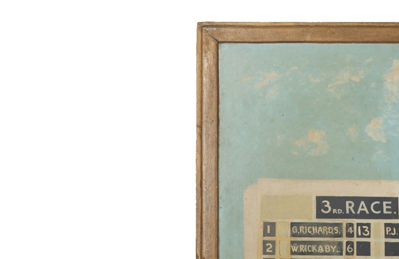 Depicted is a race track with the jockey W. Rickaby [no.6] mounted on his horse. To the rear is the tote board for the 3rd Race with the names of well known flat race jockeys of the time. Listed is Lester Piggott, the world famous jockey, and Rickaby's cousin. It is one sided and ready to hang. Lots of detail, with well dressed racegoers, a Shipstones Ales sign and even an ice cream stand can be seen by the marquee.