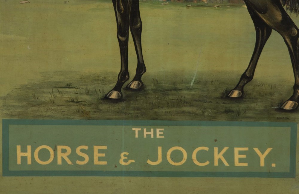 Large mid-20th Century English painted pub sign titled 'The Horse & Jockey'. Signed by the artist, S.Brewin below the horse's rear hoof.