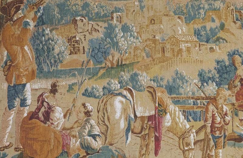 Large 20th Century French screen printed tapestry 'La Halte Des Chasseurs' (Hunter's Halt).