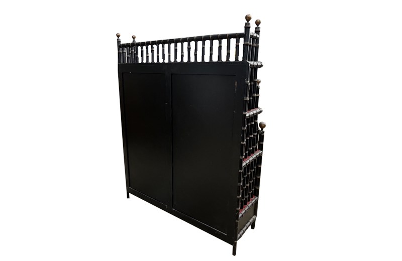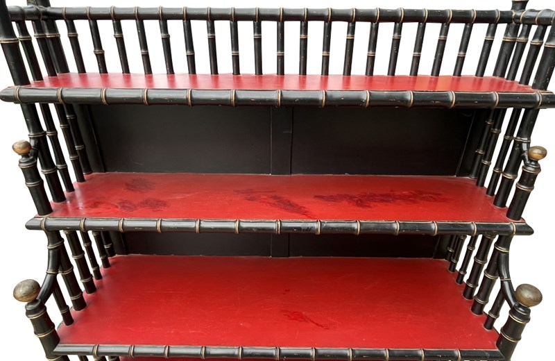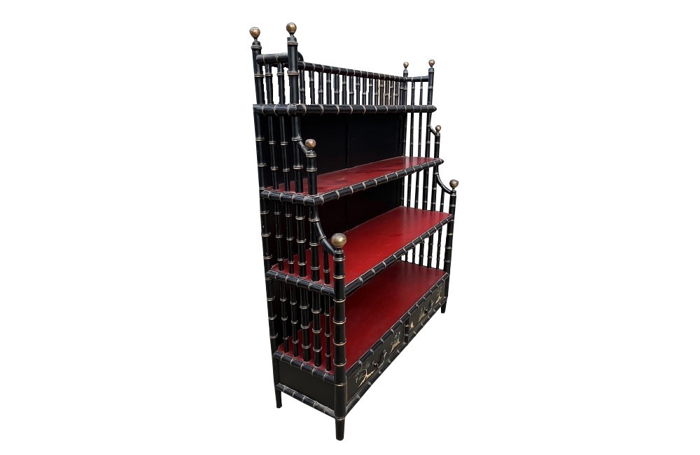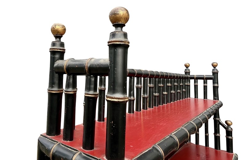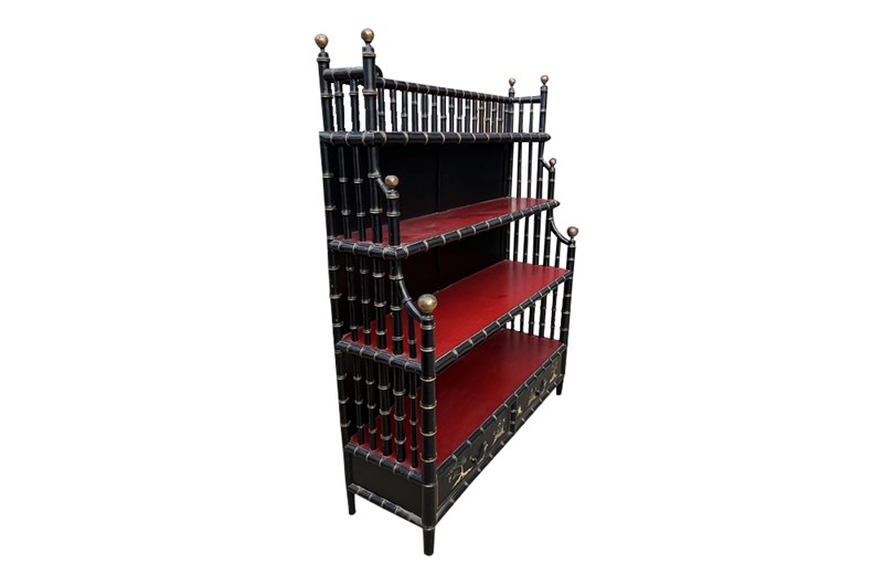 An impressive mid-20th century faux bamboo étagère of generous scale, finished in black lacquer with striking oxblood red shelves. The structure is formed from turned faux bamboo supports with ball finial terminals, giving the piece a strong architectural presence.