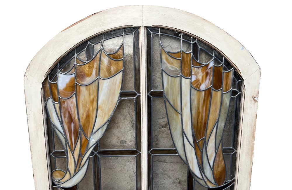 Fabulous French arched double-panel window, featuring hand-leaded stained glass.