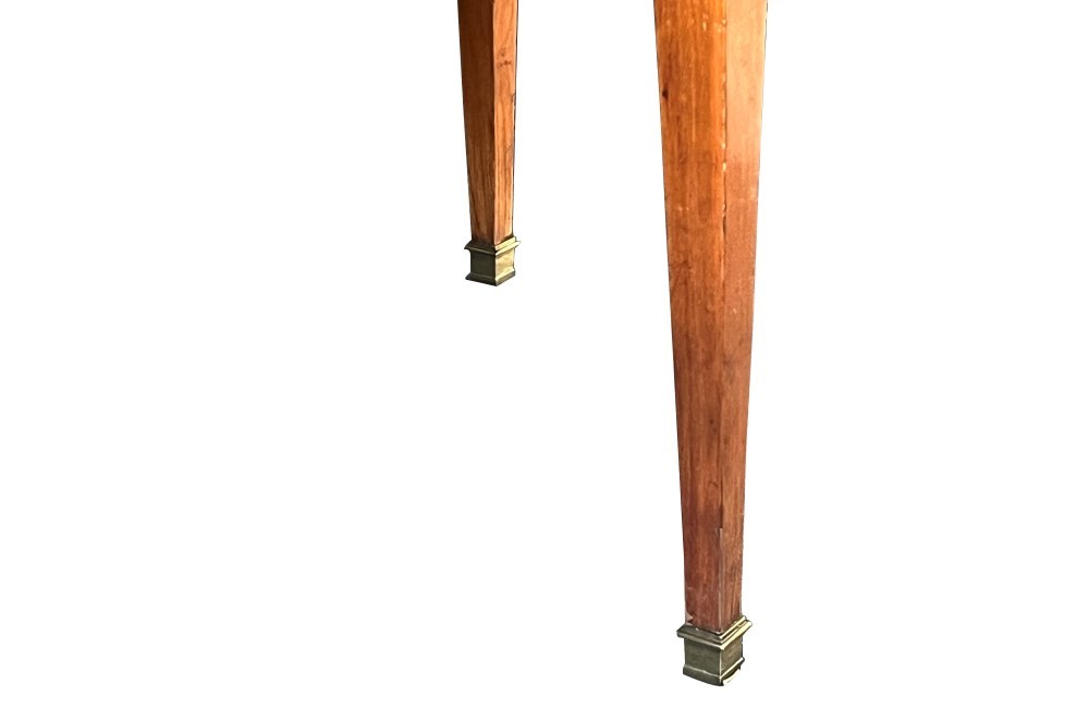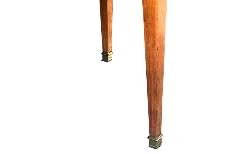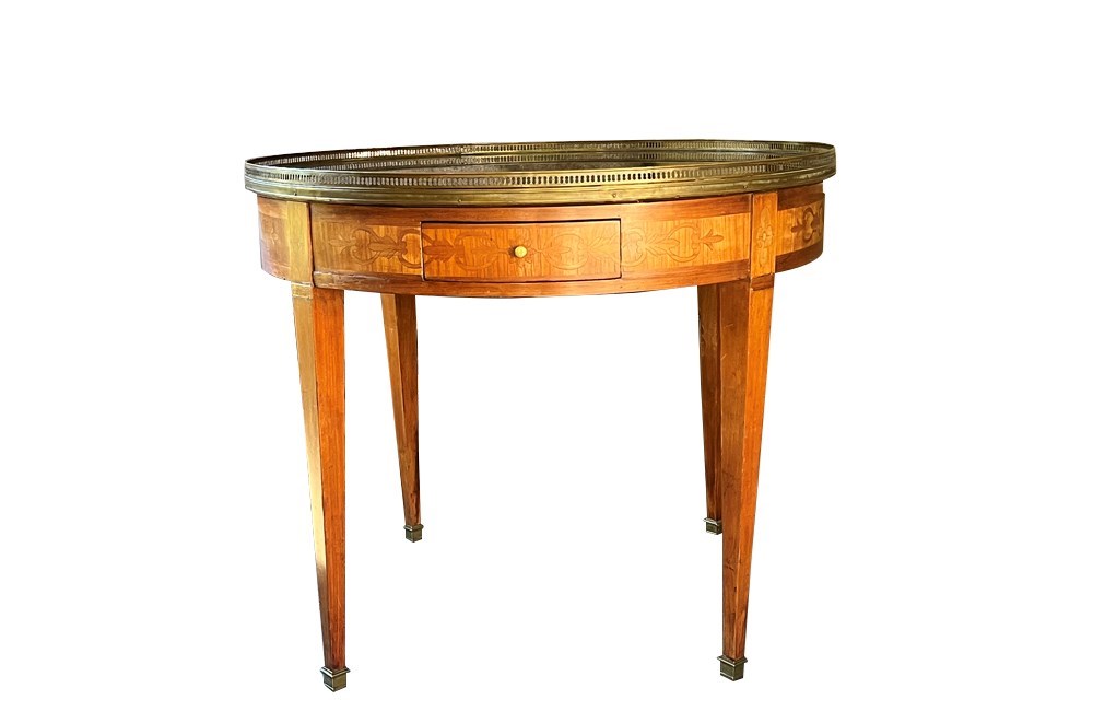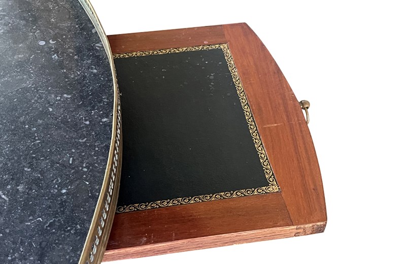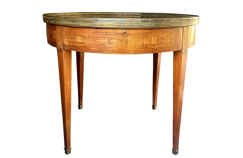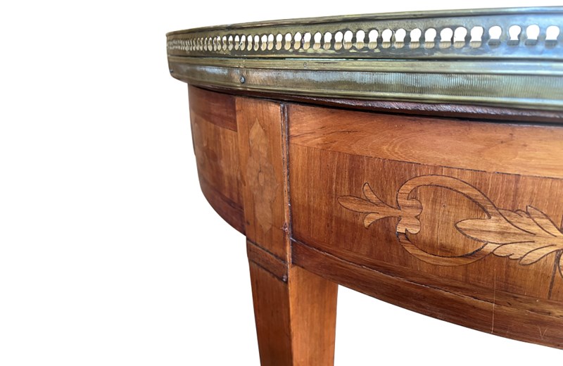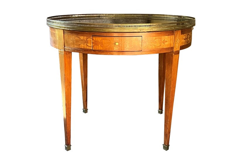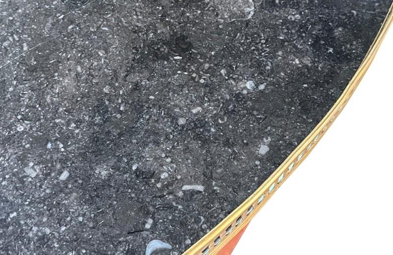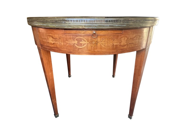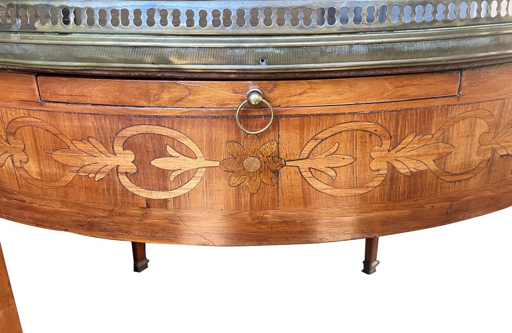 Large marquetry kingwood veneer guridon table. It has a lovely dark grey marble top in a pierced raised brass gallery. Floral and foliate marquetry motifs