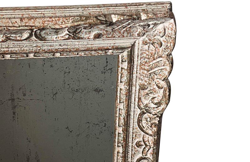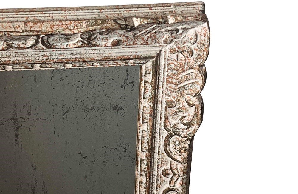 With lovely old foxed mirror glass and Montparnasse carved frame with original paint and patination.