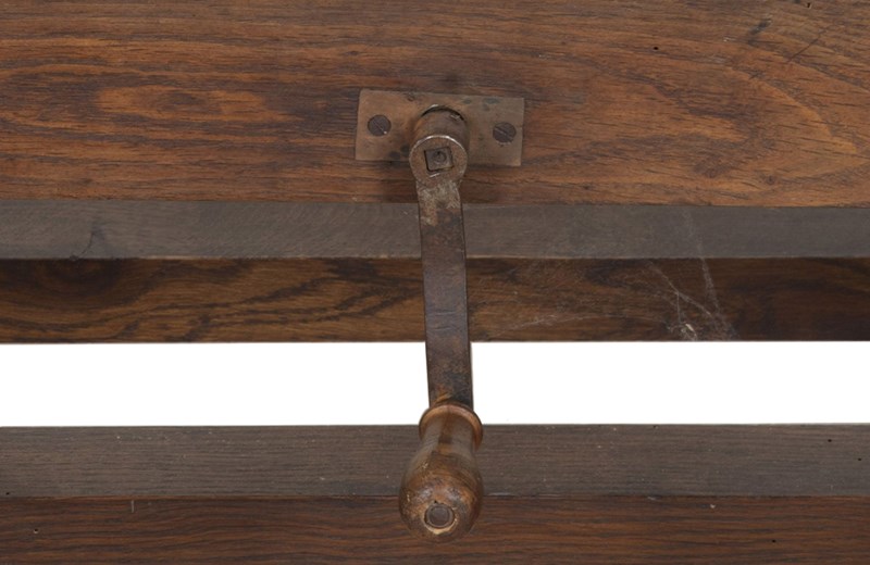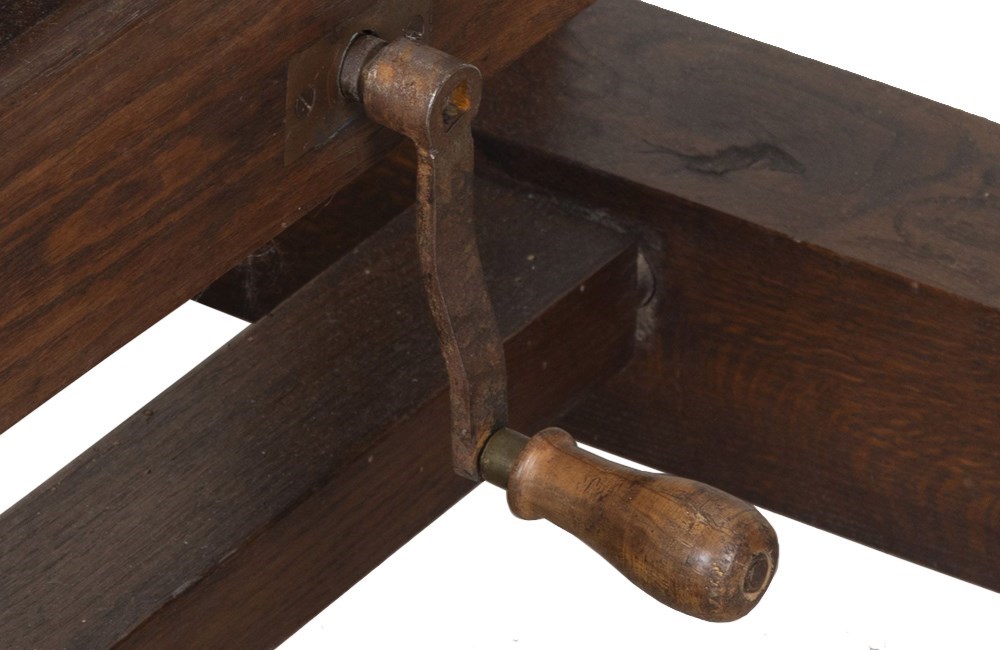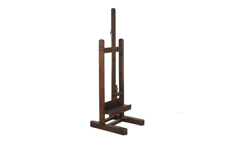 French, oak artist's easel with hand crank mechanism for adjusting height with iron turning screw. Sturdy H frame on casters