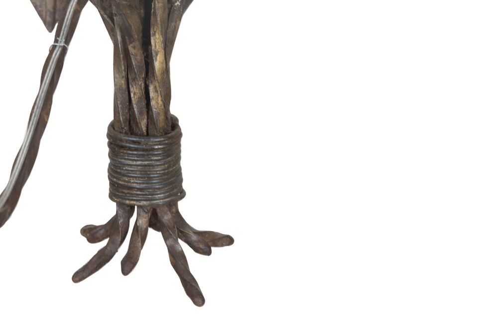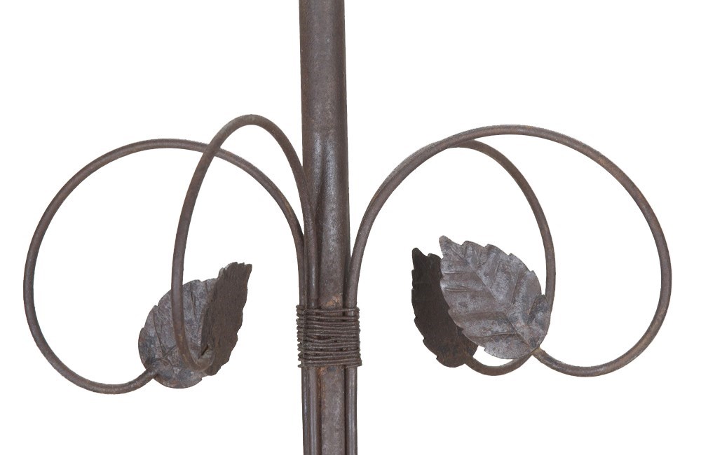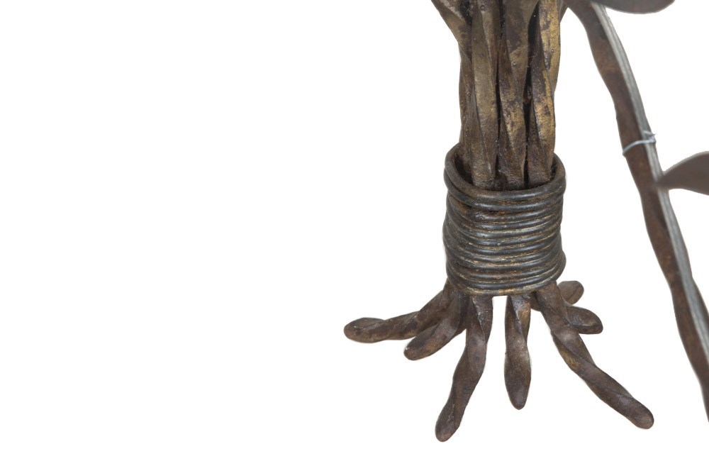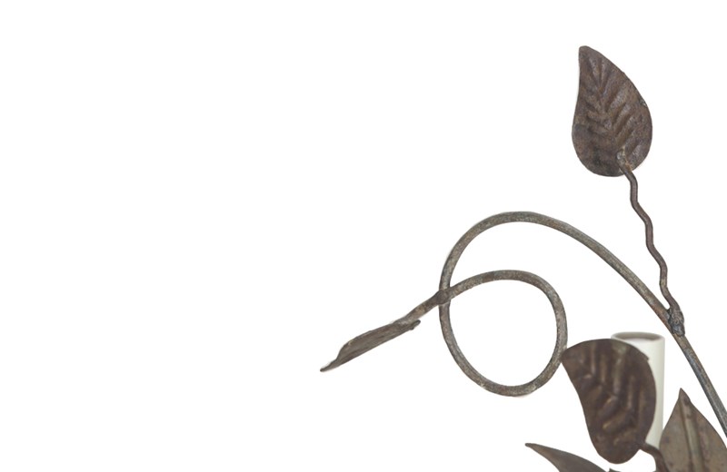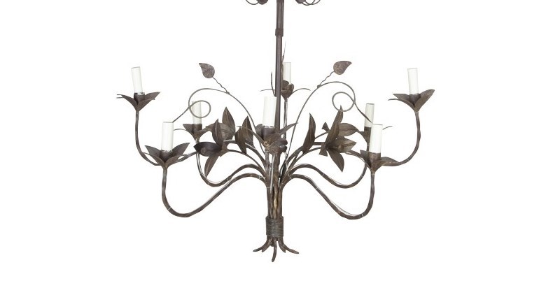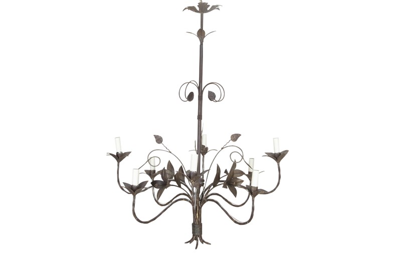 With decorative open petal flowers and leaves on curved stems. Eight curved twisted iron arms terminate on foliate candle / bulb holders and are wired at the base of stems in tied bouquet form. Midway up the stem are further curved stem foliate embellishments leading to more leaves. Terminating with a foliate ceiling rose.