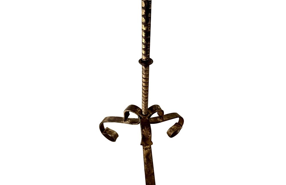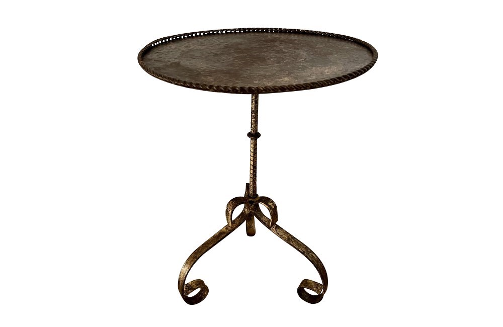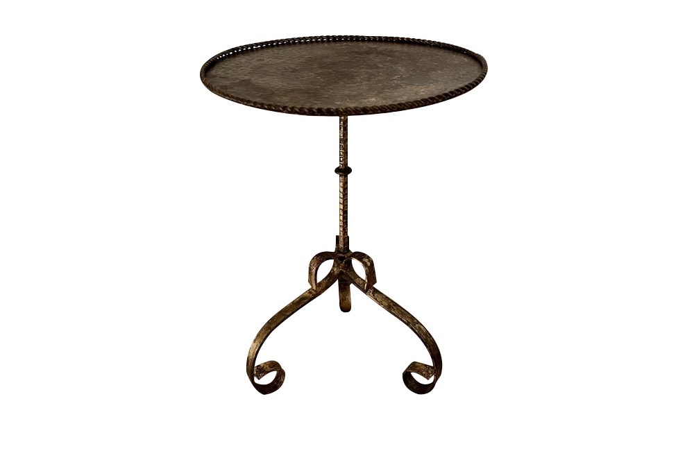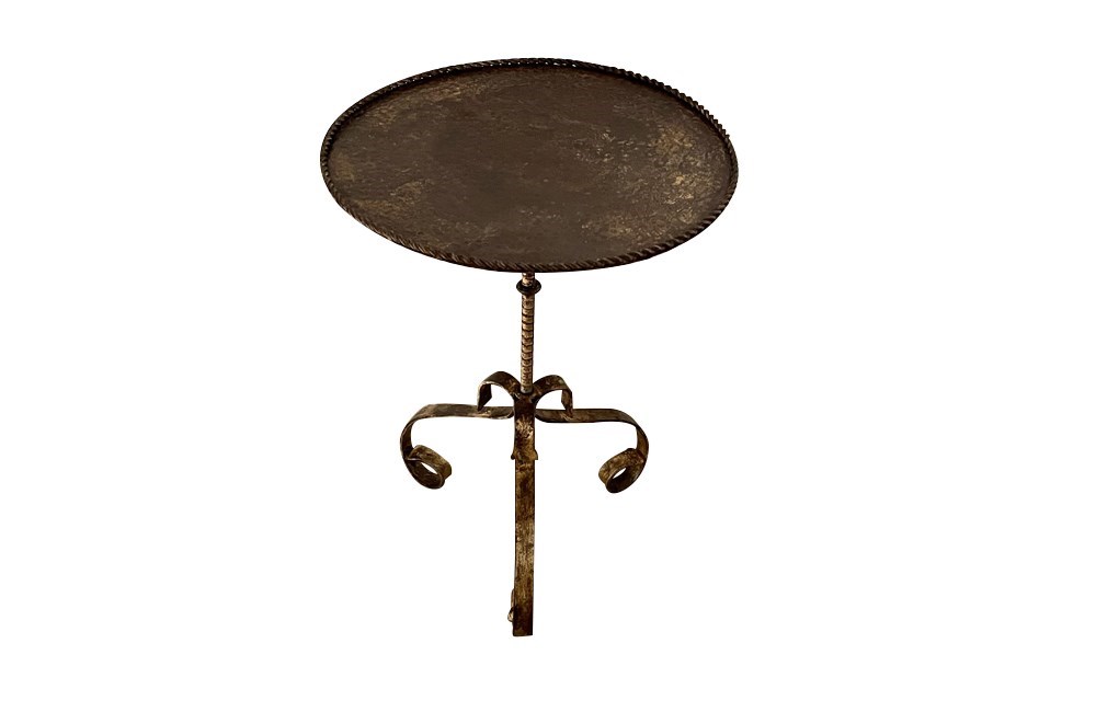 The circular tray top, measuring 41cm in diameter, features a textured surface and a decorative rope-twist edge. It is supported by a slender central stem with a hammered finish, rising from an elegant three-legged base formed of hand-wrought iron scrolls terminating in tight curled feet. The sculptural base and warm gilt patina give the piece a distinctive mid-century Mediterranean character, combining decorative craftsmanship with practical function.