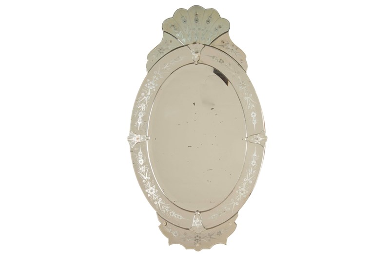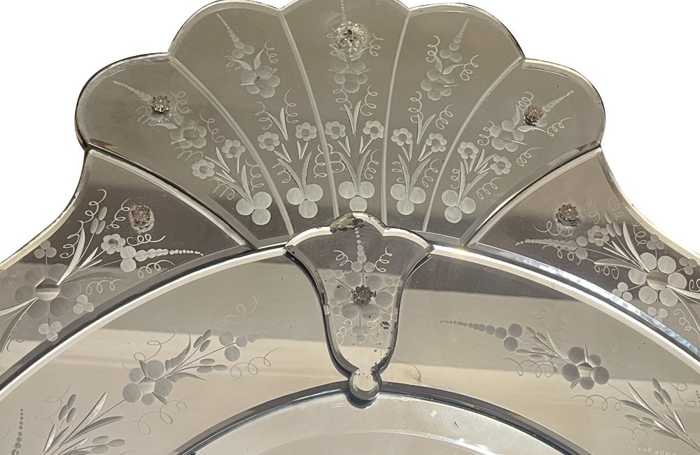 Featuring an etched and bevelled glass surround with softly scalloped edges and applied floral glass details. The decorative border is finely engraved with stylised floral motifs, typical of Venetian-inspired mirrors produced in the mid-20th Century. The mirror plate shows light age-related spotting, consistent with the period and adding character without detracting from its reflective quality.