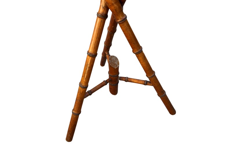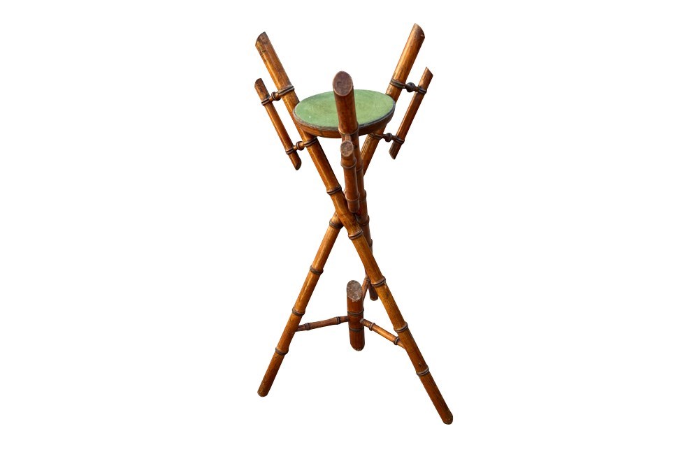 Charming late 19th-century French plant stand crafted in a faux bamboo turned wood frame, finished in a warm honey tone. The tripod base and decorative upright supports reflect the period’s fascination with exotic, naturalistic forms, that were popular in European interiors at the end of the 19th century.
