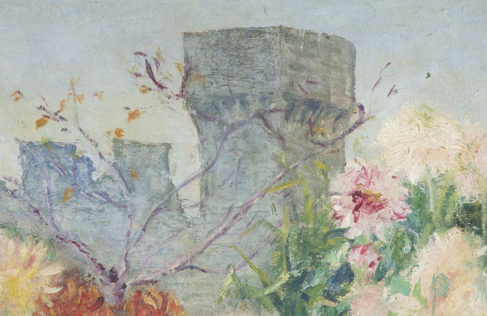 Large and colourful chrysanthemums fill the canvas with a view of the walls of Avignon in the sky beyond.