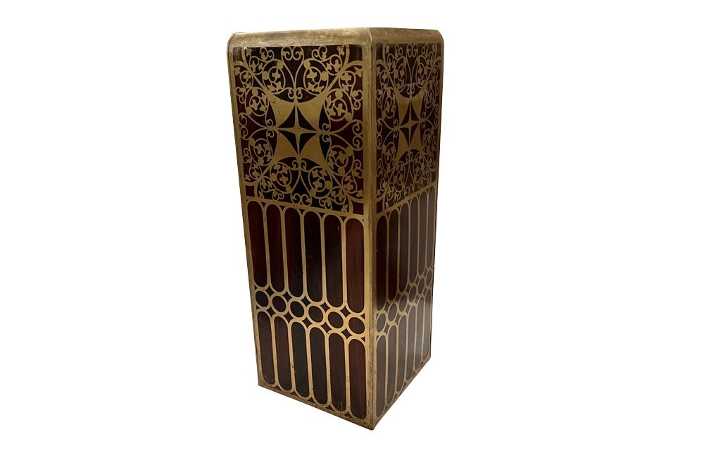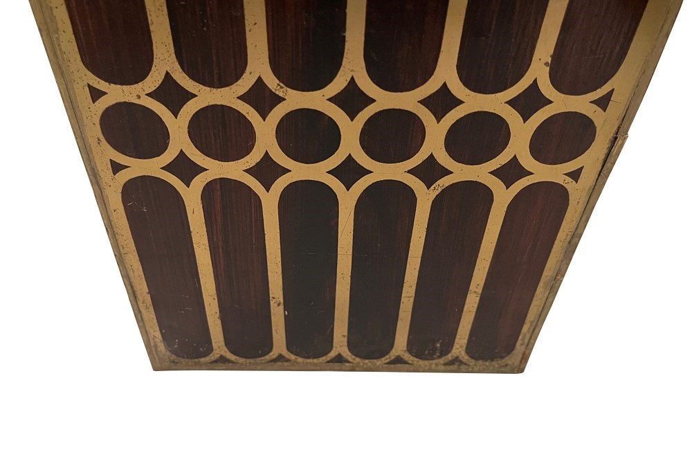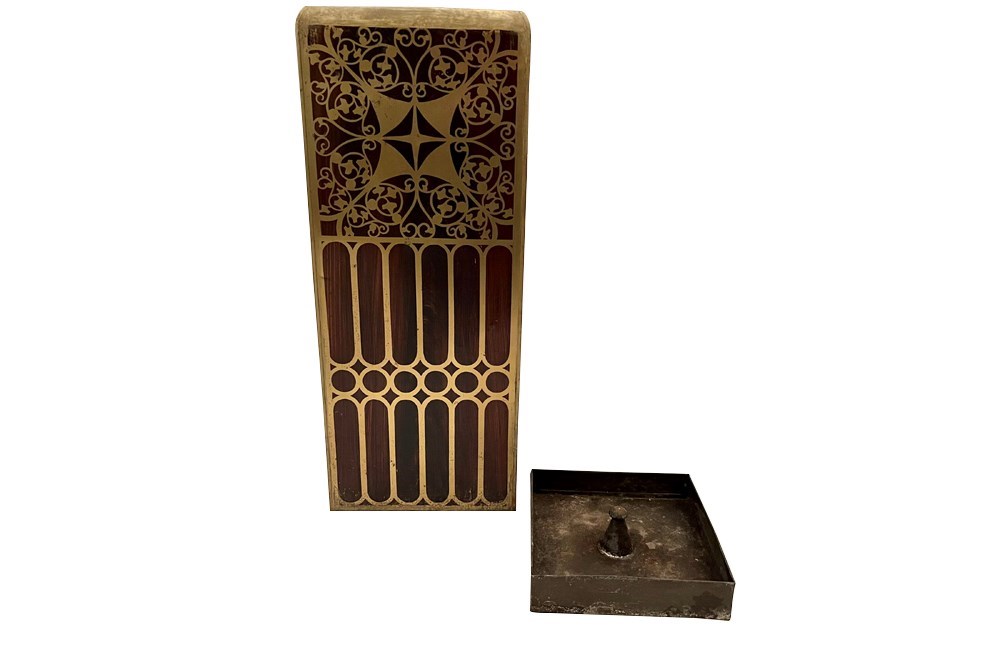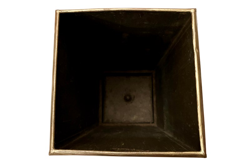 Each side in Trompe L'oiel Neo-Gothic style painted gold decoration to appear as brass ornamentation on a faux wood painted finish. This lovely Art & Crafts toleware bin has a fine brass strip to each corner side edge.