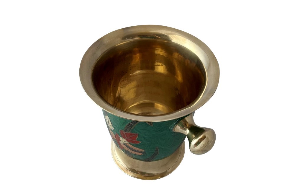 Mid-Century enamelled brass wine cooler with floral and foliate themed decoration and brass handles.