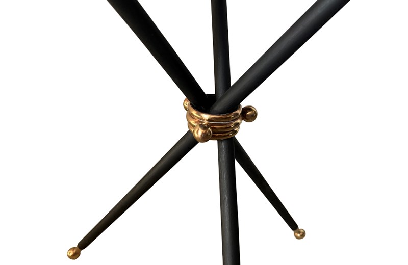 French folding black metal tripod table base with brass ringed handles and central triple band. The tapered legs terminate on brass balled feet.