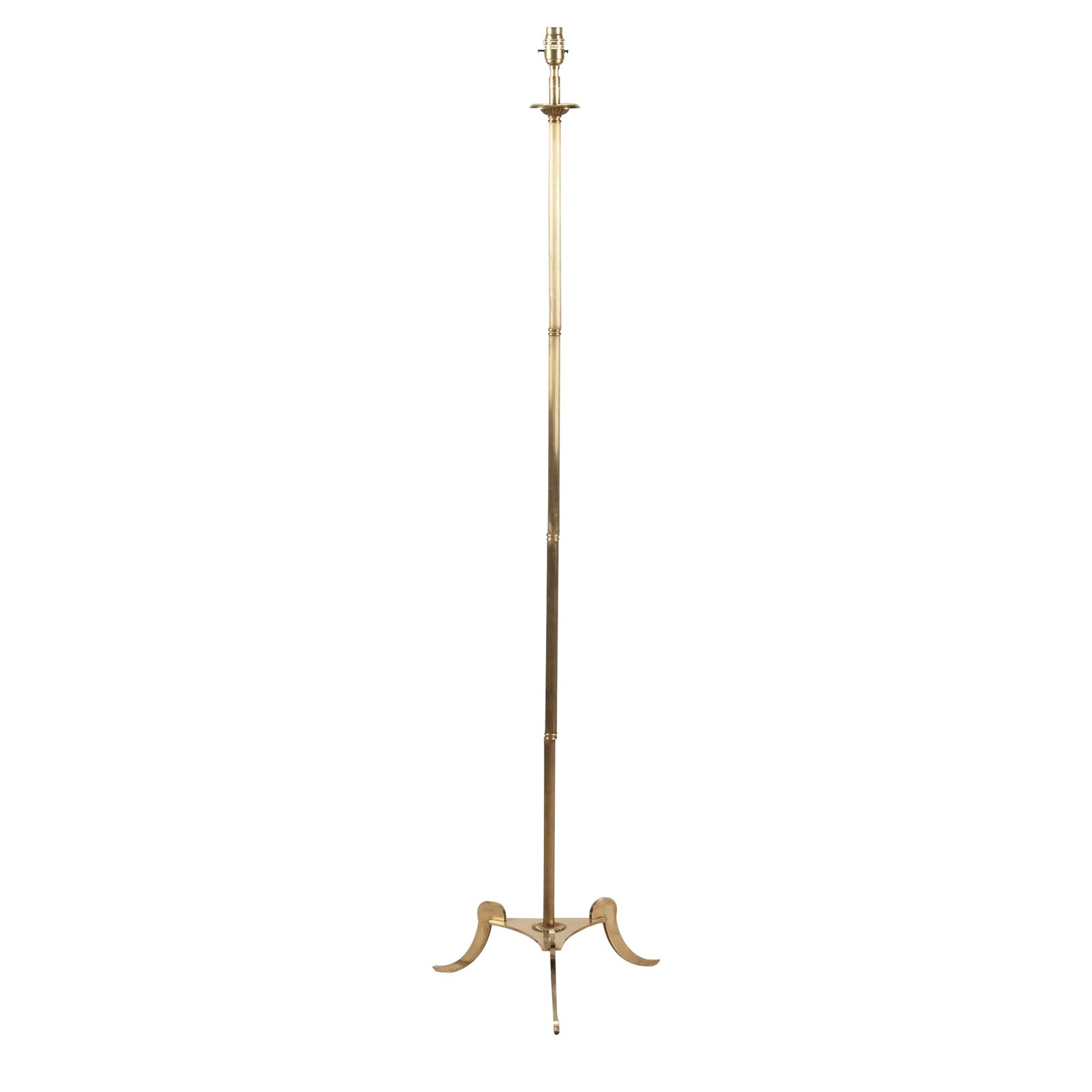 Featuring a reeded stem with fluted cup bulb holder to the top. The column terminates on an elegant tripod base with gently curved legs.