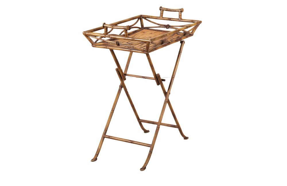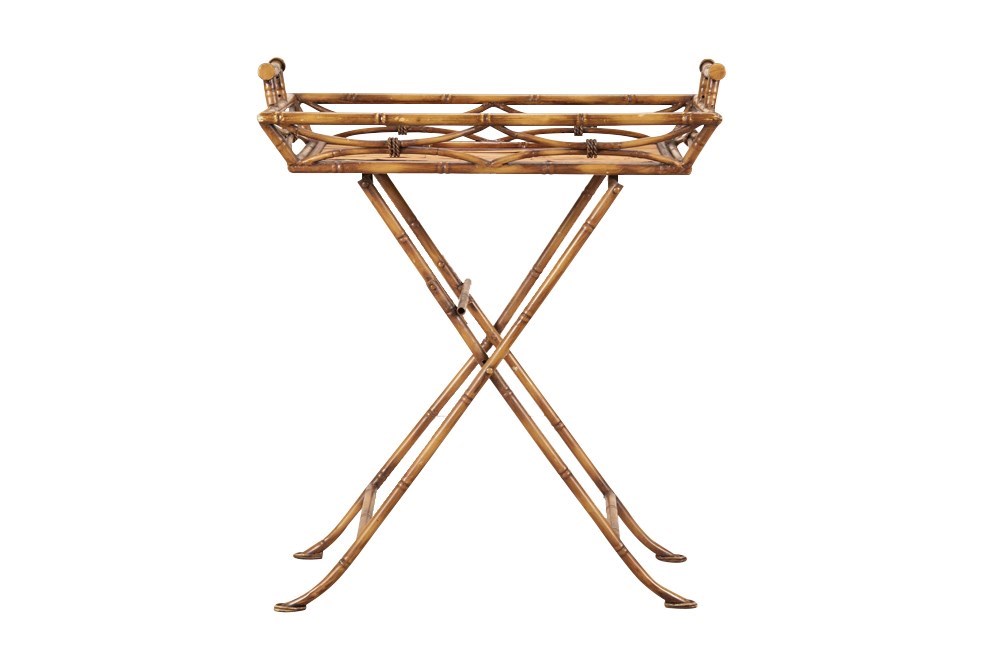 The rectangular tray is incorporated into the frame and features a bamboo-slat surface with raised gallery sides. On a classic X-form folding base, allowing the table to collapse for easy storage. A stylish and practical accent piece, ideal as a serving table, drinks stand, or occasional side table.