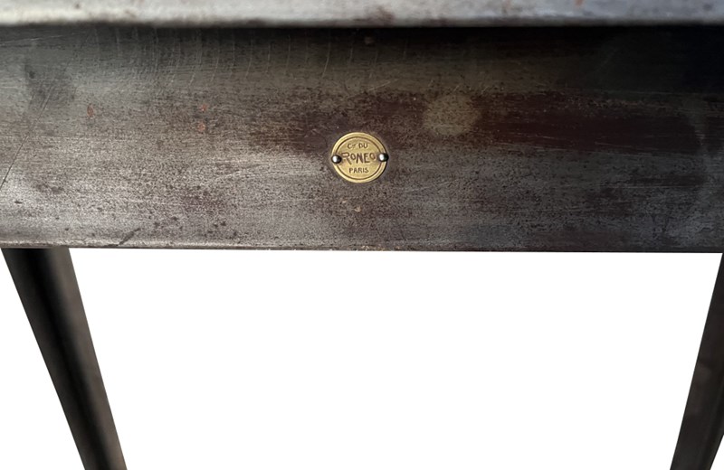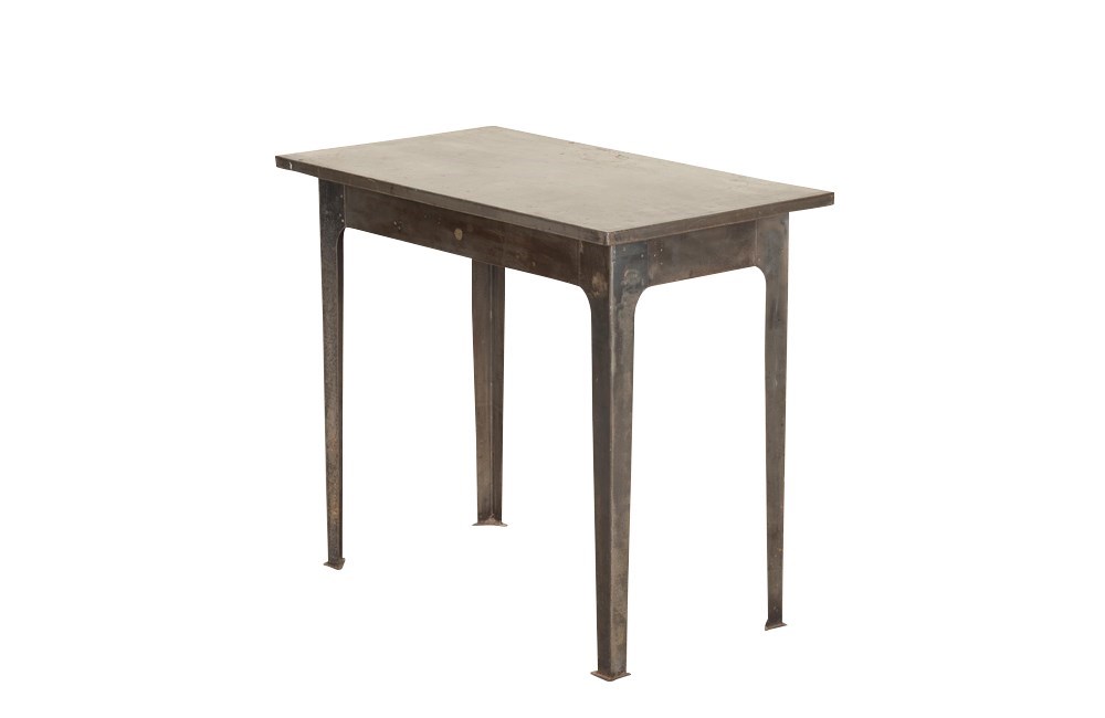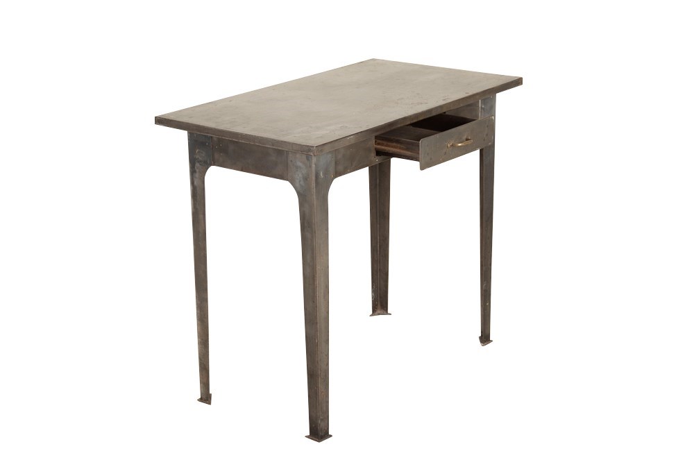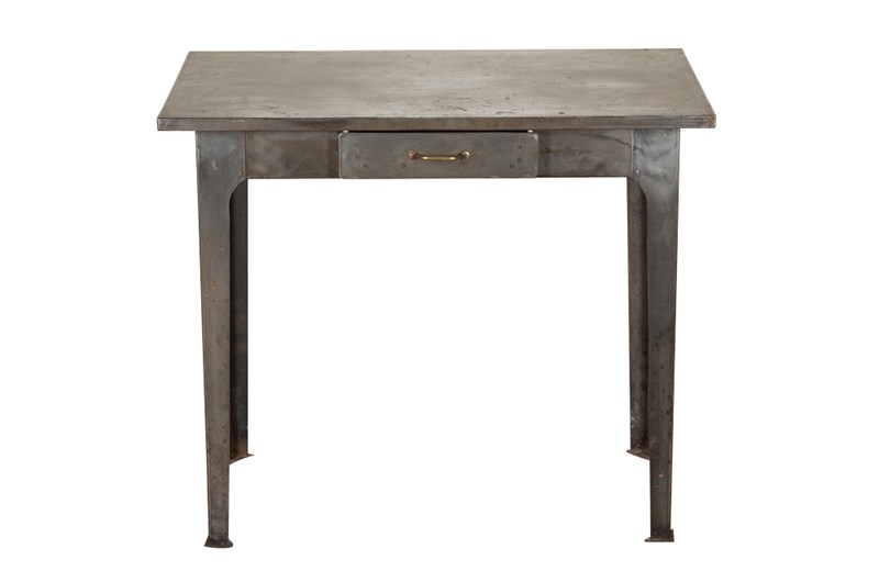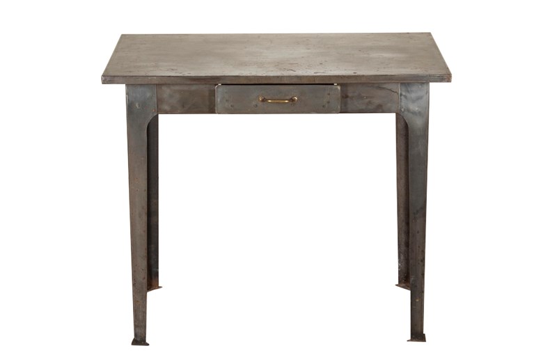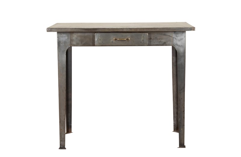 Constructed in steel with solid metal worktop, this piece embodies classic French workshop and office design from the mid-20th Century. Featuring a single central drawer and original brass handle.Retains its original brass maker's plaque, confirming provenance that most likely dates the desk to the 1930s -1950s.