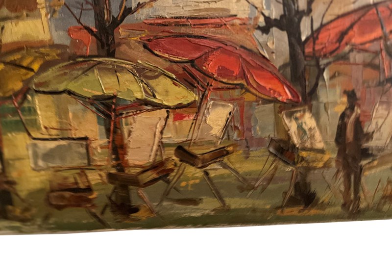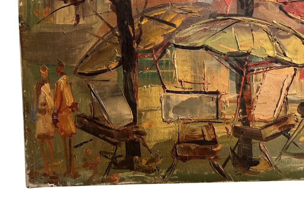 Mid-20th Century Italian oil on canvas painting of a group of artists working at their easels under the shade of parasols and trees.