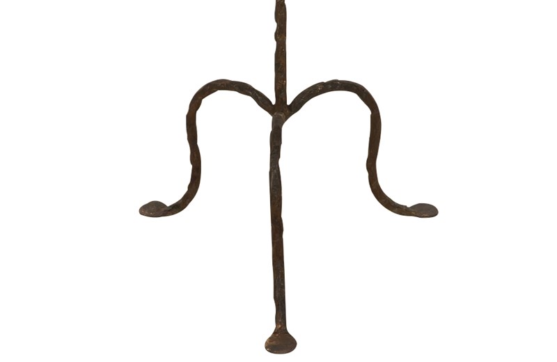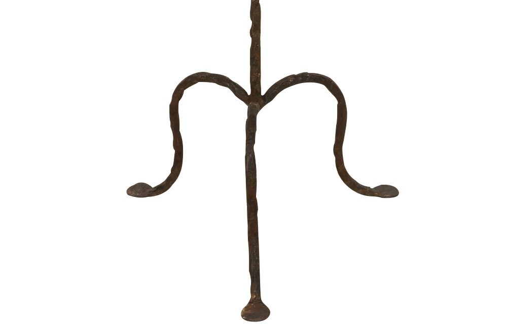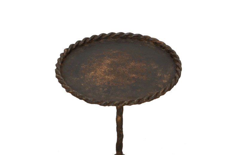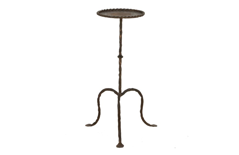 With rope twist stem, terminating on curved hammered tripod base and splayed feet. The top has a rope twist rim.