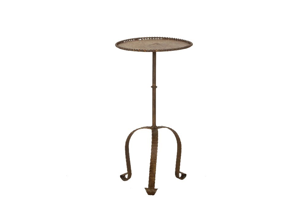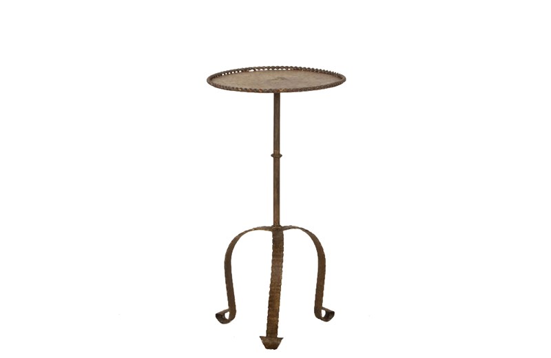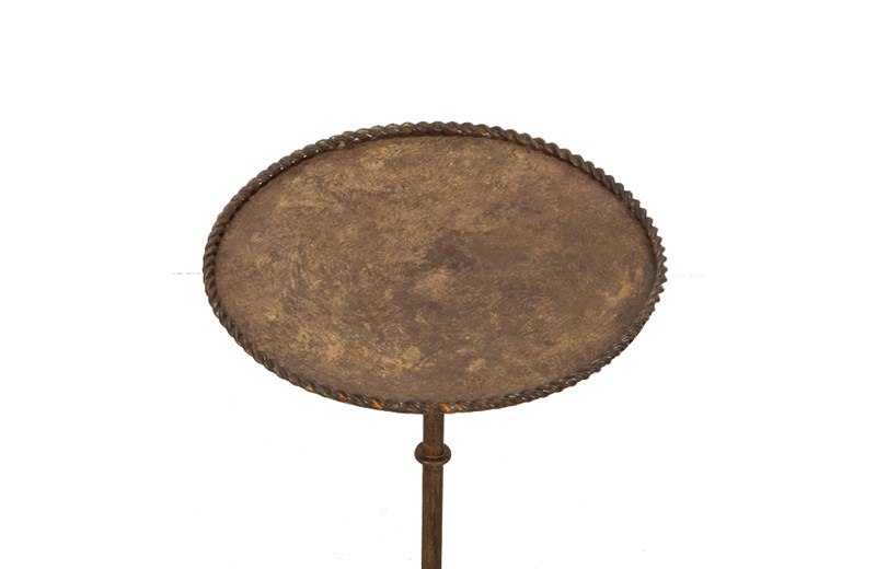 Chic little Mid-Century Spanish iron cocktail or martini table with rope rim to top.