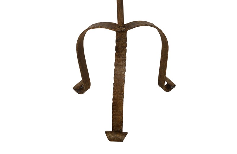 The downright bears a central ring and terminates on curved tripod base with upturned feet.
