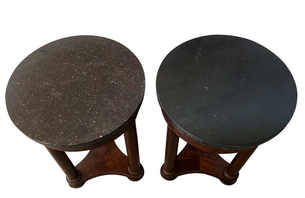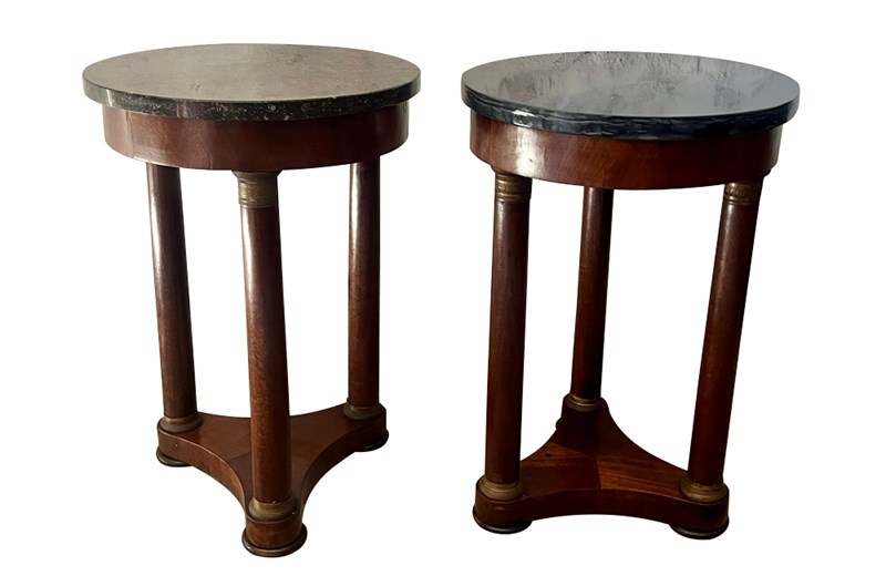 Each mahogany gueridon has a separate round marble top and bronze ornamentation to the downrights. This elegant pair of petite tables are perfect as end or bedside tables.