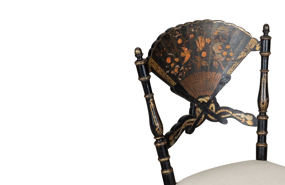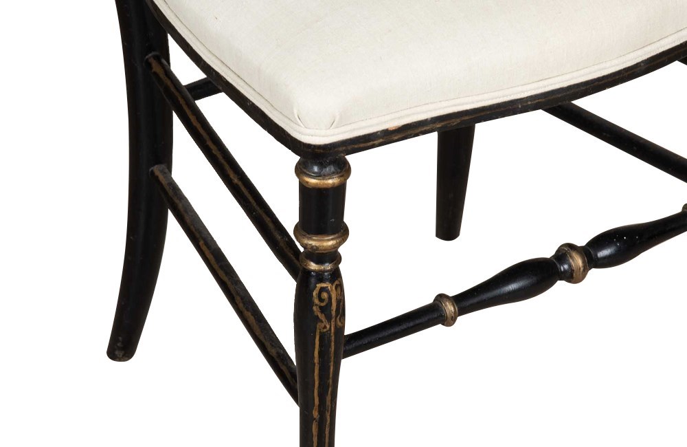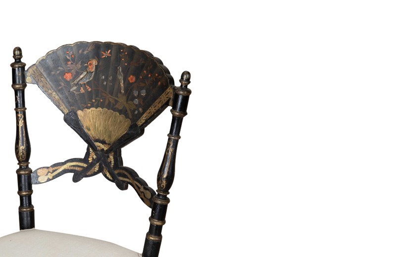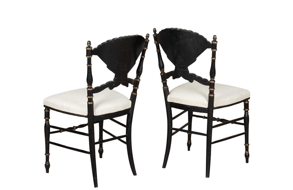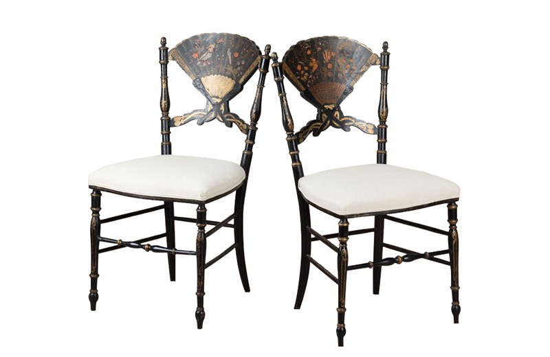 With elegant fan shaped backrests and charming decorative Chinoiserie detail. The backs are beautifully hand-painted with fan motifs, birds and floral decoration and gilt accents against a black ground. On slender turned legs and cross stretchers. The seats have been newly upholstered in antique linen with double piping.