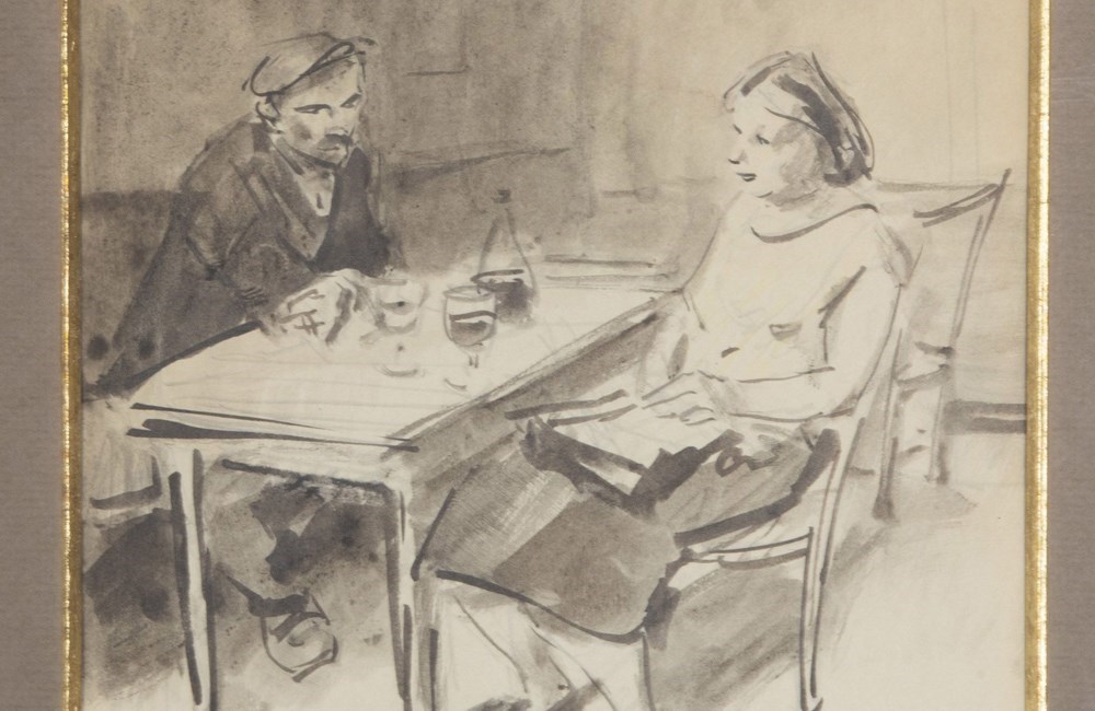 One depicts two gentlemen chatting over a bottle of wine. In the second we see a couple sharing a carafe of wine.