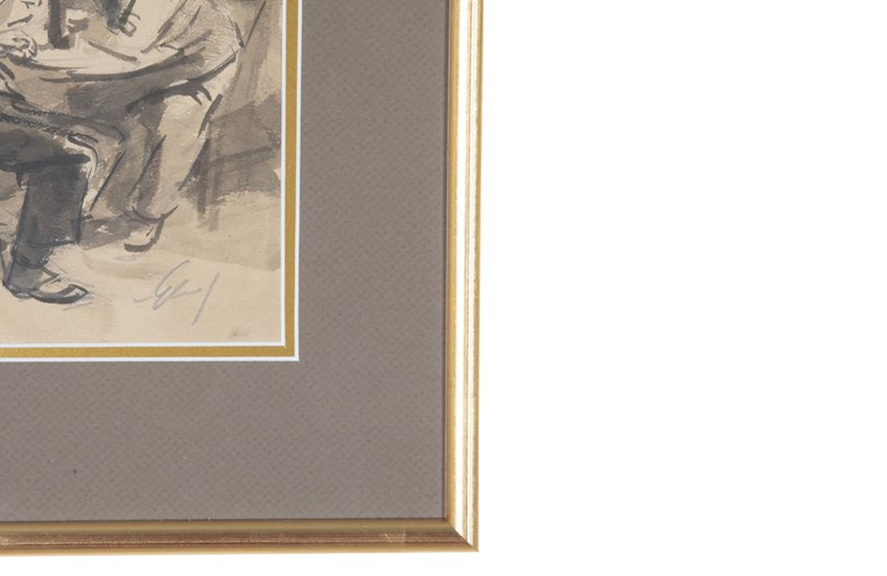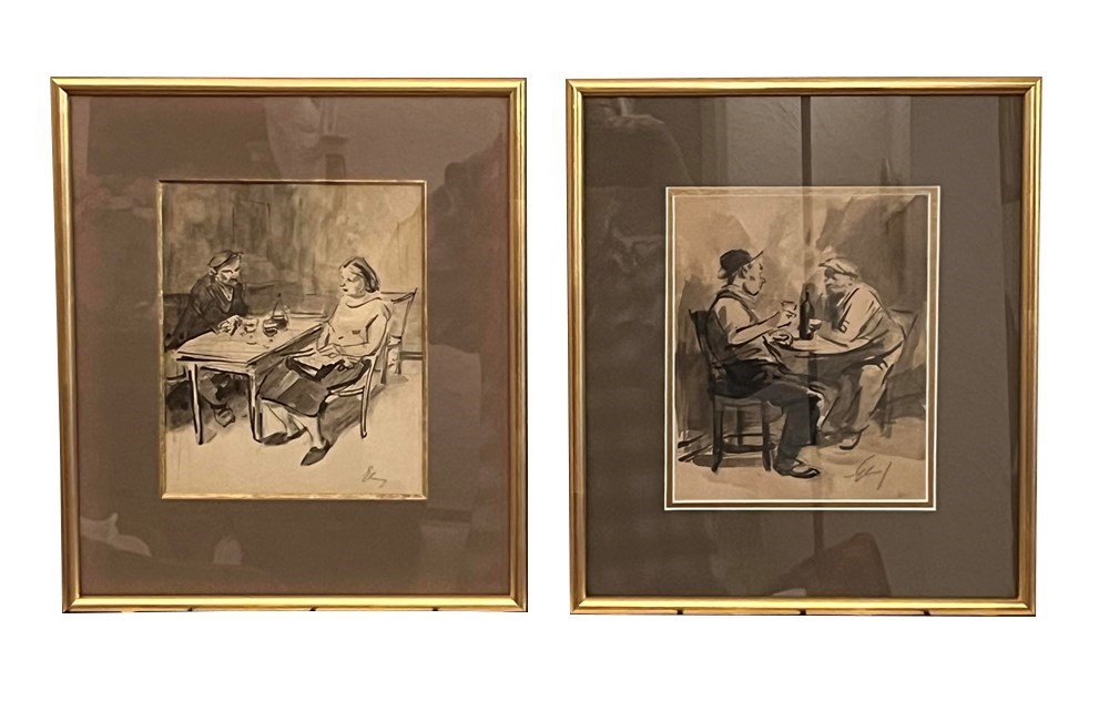 Pair Of 20Th Century Framed Drawings Of French Bistro Scenes