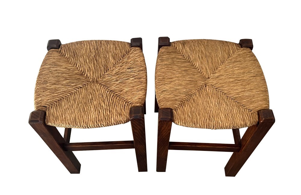 Pair of simple strawed 20th Century French country wooden stools. Circa 1960