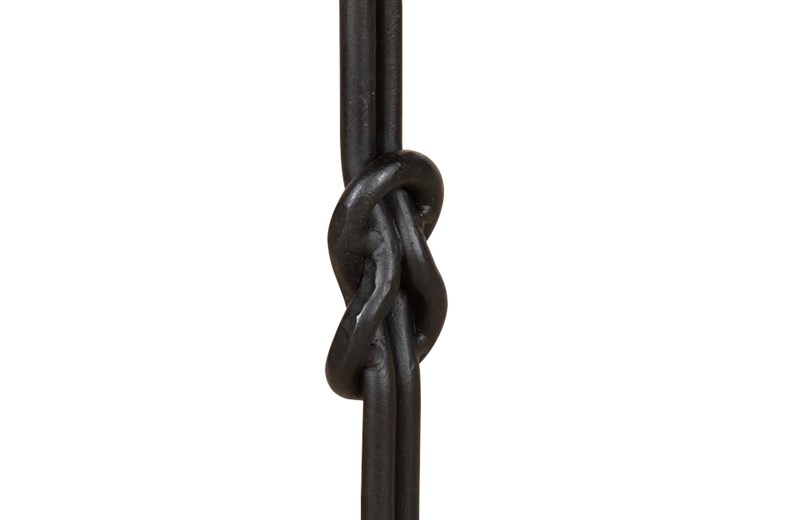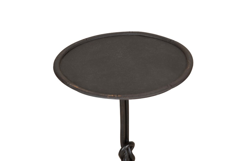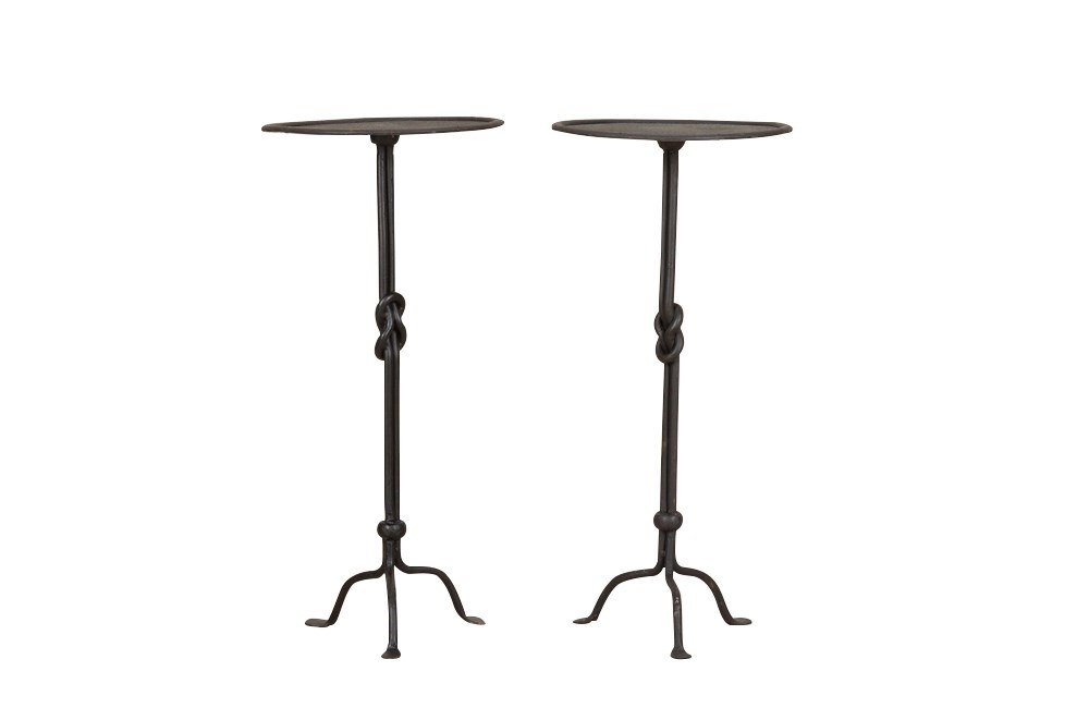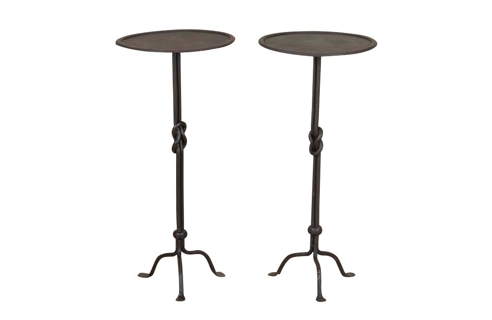 Each with double stem that terminates on a curved tripod base. These stylish iron occasional tables with knotted central design to the stem display great craftsmanship and decorative appeal.